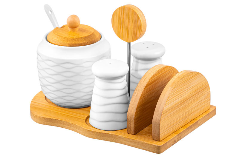 Набор - сахарница 350 мл "Айсберг волны" с ложкой + солонка + перечница + салф.на дер.подст.с ручкой