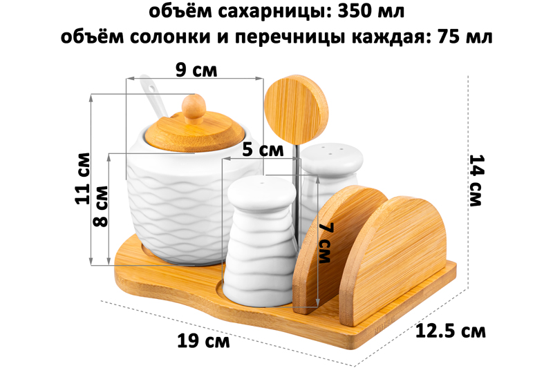 Набор посуды на бамбуковой подставке из серии «Айсберг волны» от бренда Elan Gallery предназначен для эстетичной сервировки вашего стола. Включает сахарницу с ложкой, набор для специй и встроенную салфетницу. Комплект станет воплощением прекрасного вкуса. Размер подставки – 19х12,5х14 см. По центру она оснащена ручкой в виде металлической оси с круглым декоративным элементом. Выполнена из натурального бамбука. Посуда выполнена из высококачественного белого фарфора. Он не впитывает цвет продуктов и легко отмывается, благодаря чему надолго сохраняет свою белизну. Поверхностьизделия украшают рельефные узоры в виде поперечных волн. Размер сахарницы – 9х9х11 см, объём – 350 мл. Подойдёт для сахара, соли и других сыпучих продуктов. Подайте её вместе с горячими блюдами, чтобы каждый мог приправить пищу по своему вкусу. Приспособьте под варенье, мёд или икру. Ложечка позволит удобно набрать необходимое количество продуктов и компактно помещается в баночке благодаря выемке на бамбуковой крышке. Набор для специй позволит держать под рукой необходимые приправы. Размер каждой ёмкости – 5х5х7 см, объём – 75 мл. Наполняются через отверстие снизу и закрываются пластиковой пробкой. Салфетница послужит для компактного хранения салфеток и бумажных полотенец. Не рекомендуется применять абразивные моющие средства. Фарфоровые ёмкости подходят для использования в посудомоечной машине и микроволновой печи. Бамбуковые и металлические элементы нельзя замачивать. Поставляются в дизайнерской картонной коробке – благодаря ей вам не потребуется дополнительная подарочная упаковка. Фарфоровая сервировочная посуда будет оригинальным подарком для тех, кто ценит сочетание практичности и привлекательности. Серия «Айсберг волны» от бренда Элан Галерея станет украшением любого кухонного инвентаря и позволит собрать красивый сервиз в едином стиле!