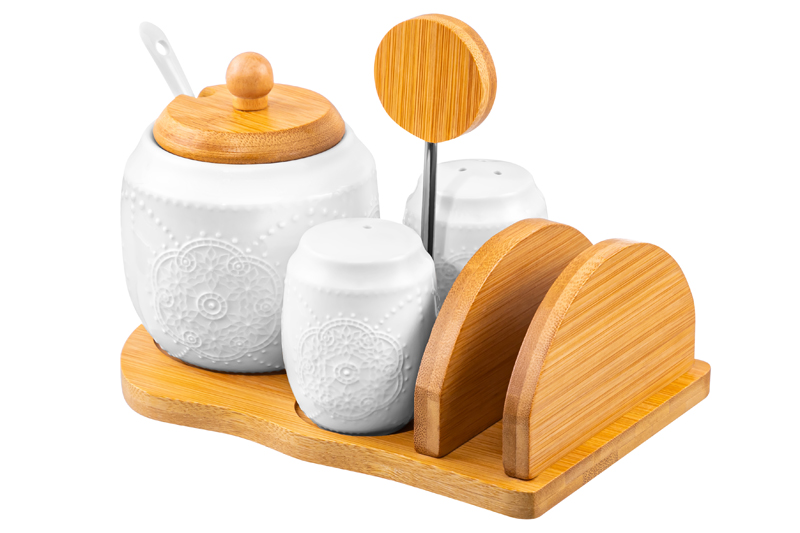 Набор - сахарница 350 мл "Жемчуг" с ложкой + солонка + перечница + салфетница на дер.подст.с ручкой
