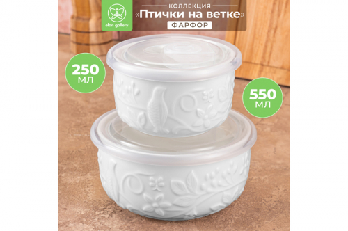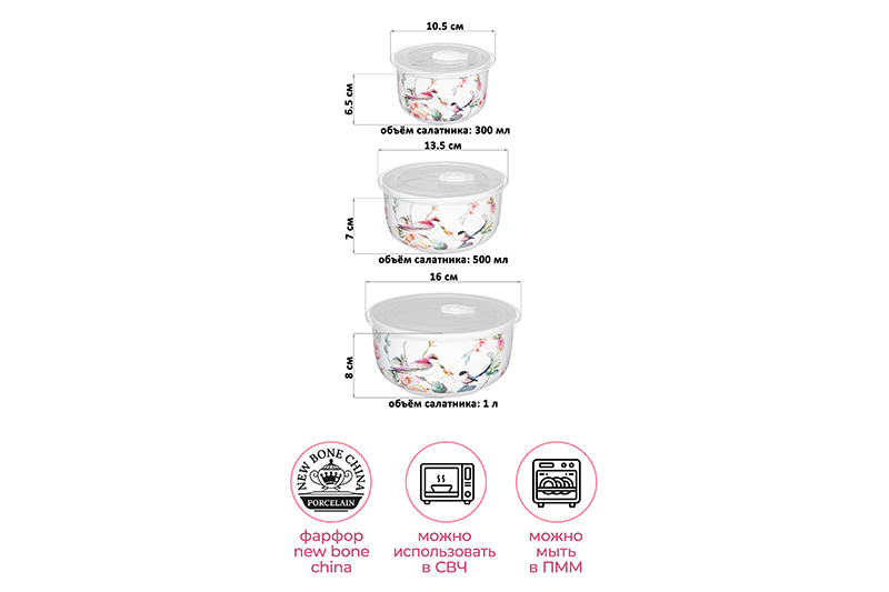 Набор 3 салатников из серии «Певчие птички» от Elan Gallery предназначен для эстетичной сервировки вашего стола. Включает в себя изделия разных размеров: 16х16х8 см (объём – 1 литр, размер без крышки – 15х15х7,5 см), 13,5х13,5х7 см (объём – 500 мл, размер без крышки – 12,5х12,5х6,5 см) и 10,5х10,5х6,5 см (объём – 300 мл, размер без крышки – 10,5х10,5х6,5 см). Выполнены из фарфора нового поколения new bone china, сочетающего в себе изящность и высокую прочность. Такие изделия легко отмываются, поэтому сохраняют привлекательный вид и практичны в использовании. От других видов костяного фарфора new bone china отличается большей экологичностью в производстве. Изделия украшены рисунком пёстрых птичек и пышных бутонов роз. Они выполнены в манере, вдохновлённой акварельным рисунком. Крышки выполнены из пластика и оснащены силиконовыми уплотнителями. Большие глубокие миски станут идеальным вариантом для любителей здорового питания. Используйте их для приготовления и подачи салатов, а также для сервирования овощей и фруктов. Кроме того, они подойдут для холодных закусок и гарниров, разнообразных сладостей и десертов. Задействуйте в качестве конфетниц для организации уютного чаепития. Герметичные крышки надёжно защитят продукты от попадания грязи и пыли и позволят хранить готовые блюда в холодильнике. Благодаря нежному дизайну изделия впишутся в интерьер любой кухни, гостиной или столовой. Не рекомендуется применять абразивные моющие средства. Можно мыть в посудомоечной машине. С открытым клапаном на крышке можно использовать в микроволновой печи. Без крышки можно использовать в духовом шкафу при температуре до 230 градусов. Поставляются в дизайнерской картонной коробке – благодаря ей вам не потребуется дополнительная подарочная упаковка. Фарфоровая сервировочная посуда будет оригинальным подарком для хозяйки, ценящей не только практичность, но и привлекательность. Серия «Певчие птички» от бренда Элан Галерея подарит вам ощущение мечтательной лёгкости!