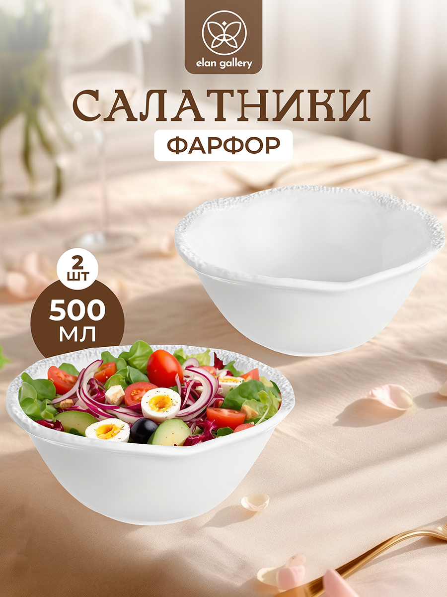 Набор 2 салатников из серии «Шарм» от Elan Gallery предназначен для эстетичной сервировки вашего стола. Размер каждого изделия – 15,5х15,5х6,5 см, объём – 500 мл. Выполнены из высококачественного белого фарфора. Он не впитывает цвет продуктов и легко отмывается, благодаря чему надолго сохраняет свою белизну. По кайме глубокие блюда украшены рельефным узором, напоминающим пену или пористое суфле. Миски с фигурным краем станут идеальным вариантом для любителей здорового питания. Используйте их для приготовления и подачи салатов, а также сервирования овощей и фруктов. Кроме того, они подойдут для холодных закусок и гарниров, разнообразных сладостей и десертов. Задействуйте их в качестве конфетниц для организации уютного чаепития. Не рекомендуется применять абразивные моющие средства. Подходят для использования в посудомоечной машине и микроволновой печи. Поставляются в дизайнерской картонной коробке – благодаря ей вам не потребуется дополнительная подарочная упаковка. Фарфоровая сервировочная посуда будет оригинальным подарком для хозяйки, ценящей не только практичность, но и привлекательность. Серия «Шарм» от бренда Элан Галерея станет украшением любого кухонного инвентаря и позволит собрать красивый сервиз в едином стиле!
