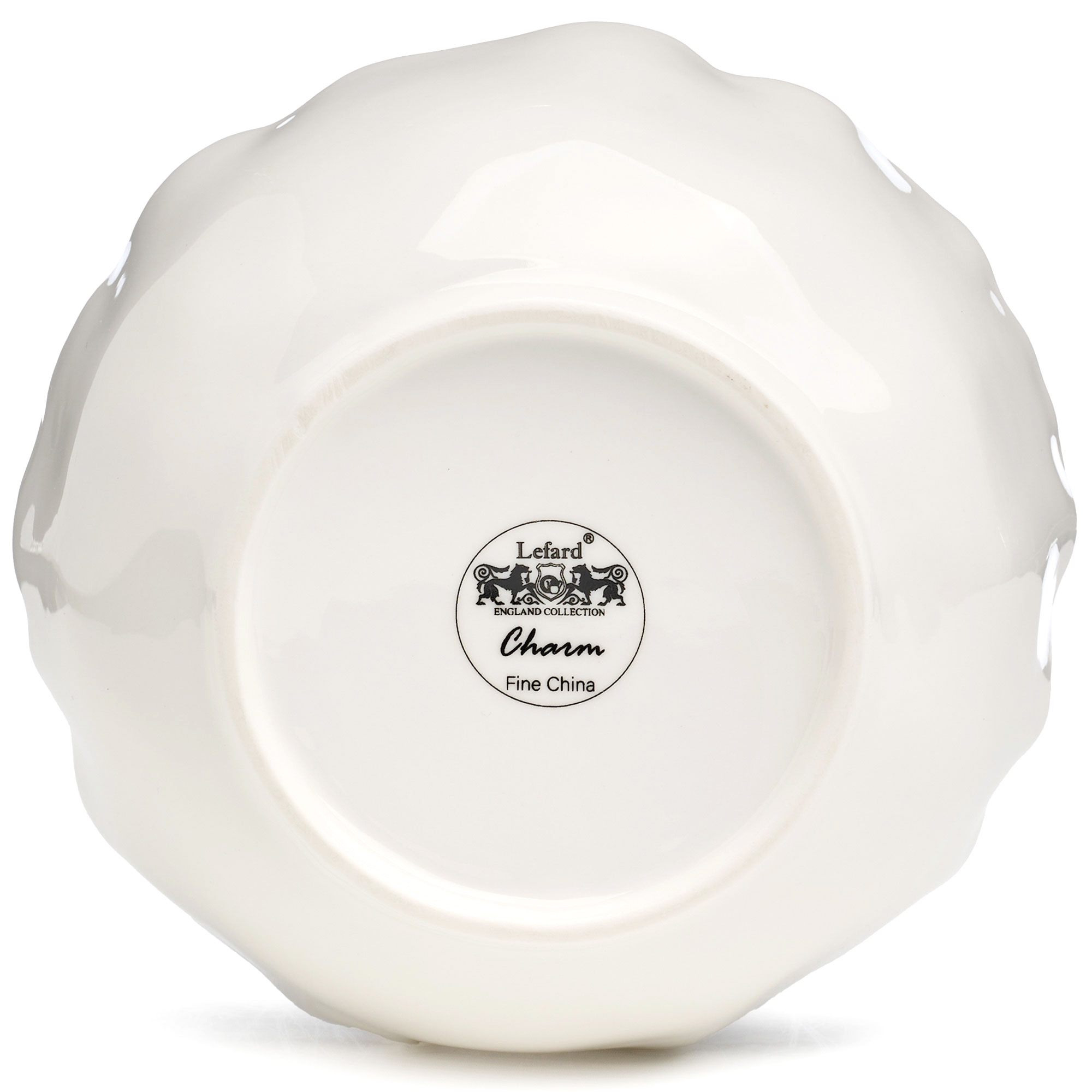 ТМ LEFARD "Charm" - добавьте нотку изысканности и утонченности в сервировку вашего стола с этой очаровательной коллекцией. Белоснежный "мятый" фарфор с волнистым краем и деликатной тонкой окантовкой - идеальный баланс между простотой и элегантностью. Глянцевая глазурь придает поверхности особый блеск, делая изделие приятным как для глаз, так и на ощупь, а тончайшая золотая окантовка, которая нанесена вручную, подчеркивает утонченность и добавляет праздничного шика. Коллекция подходит как для повседневного использования, так и для особых случаев. Не рекомендуется использовать в посудомоечной машине и микроволновой печи для сохранения целостности золотой окантовки. Вся посуда прошла сертификацию и безопасна для контакта с пищевыми продуктами.