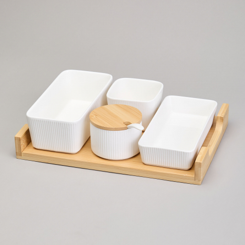 Комплектация: менажница 500 мл. - 1 шт., менажница 250 мл. - 1 шт., менажница 170 мл. - 1 шт., банка с бамбуковой крышкой и ложкой 100 мл. - 1 шт.