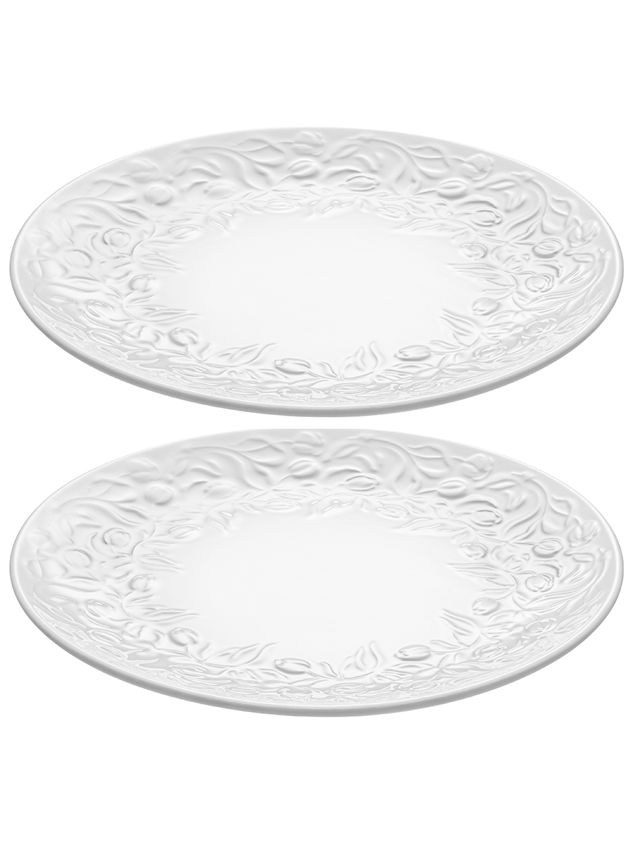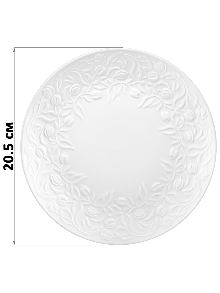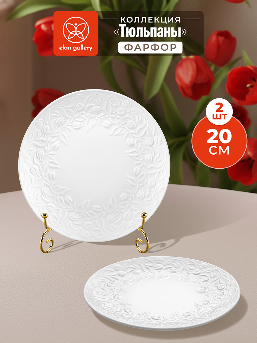Набор 2 тарелок Elan Gallery "Тюльпаны" выполнен из белого фарфора, украшен рельефными узорами с цветами. Размер каждого изделия — 20,5х20,5х2 см. Тарелочки в классическом стиле подойдут к любому интерьеру кухни или гостиной. Можно использовать как десертные или для вторых блюд. Положите на сервировочное блюдце кусочек торта, домашнего пирога или пирожное. Небольшая тарелочка подойдёт для подачи закусок: сырной нарезки, сырокопчёной колбасы или свежих овощей и зелени. Разместите на блюде выпечку и сыр, чтобы перекусить за чашечкой кофе на завтрак. Фарфоровая посуда отличается от керамической повышенной плотностью. Фарфор не впитывает цвет продуктов и не деформируется от влаги, чему может быть подвержена керамика. Каждое блюдечко легко отмывается и надолго сохраняет привлекательный вид. Не рекомендуется применять абразивные моющие средства. Беречь от резких перепадов температур и механических повреждений. Можно использовать в микроволновой печи и мыть в посудомоечной машине. Комплект поставляется в стильной картонной коробке. Станет прекрасным подарком на любой праздник. Благодаря стильной коробочке не понадобится дополнительная подарочная упаковка! Красивые блюдца восхитят ваших гостей и добавят элегантности при сервировке стола как в будни, так и на праздник. В коллекции бренда Элан Галерея можно найти много красивого кухонного и столового инвентаря, а также собрать сервиз на свой вкус.