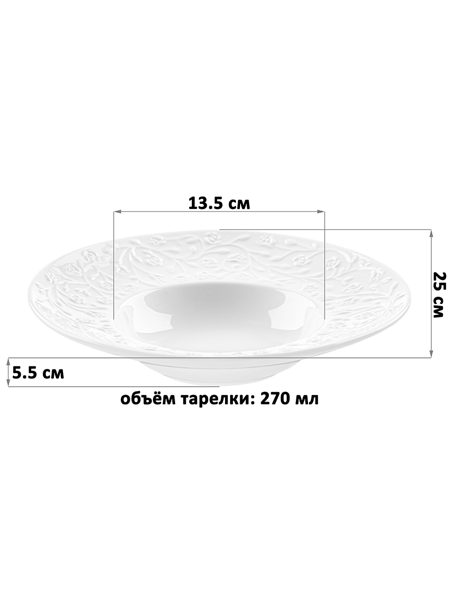 Набор 2 тарелок Elan Gallery "Веточки-цветочки" размером 25х25х5,5 см каждая выполнен из белого фарфора. Внутренний диаметр каждой суповой тарелки 13,5 см, объём – 270 мл, размер дна 8,5 см. Посуда серии украшена рельефным узором в виде изящных веточек с маленькими цветочками. Глубокие круглые тарелочки подойдут для подачи супов, бульонов и каш. Эргономичная форма посуды позволяет использовать её также для любых блюд: рагу, салатов, пасты. Подойдут для сервировки как на праздник, так и в будни. Не рекомендуется применять абразивные моющие средства. Можно использовать в микроволновой печи и мыть в посудомоечной машине. Блюда поставляются в картонной упаковке. Набор станет отличным подарком для любой хозяйки, которая ценит стильную сервировку. Понравится любителям посуды в скандинавском стиле. Серия "Веточки-цветочки" позволит собрать сервиз в едином стиле и сможет стать настоящим украшением вашего дома.
