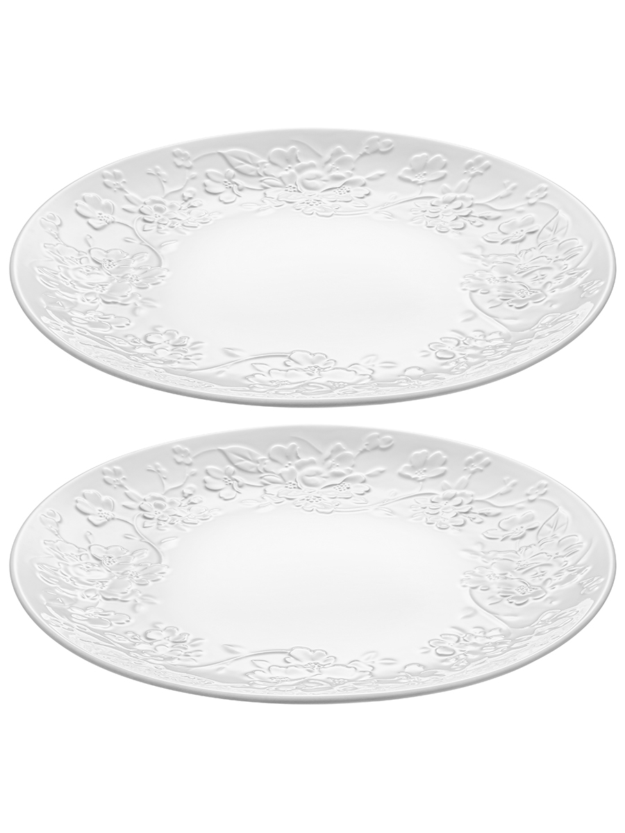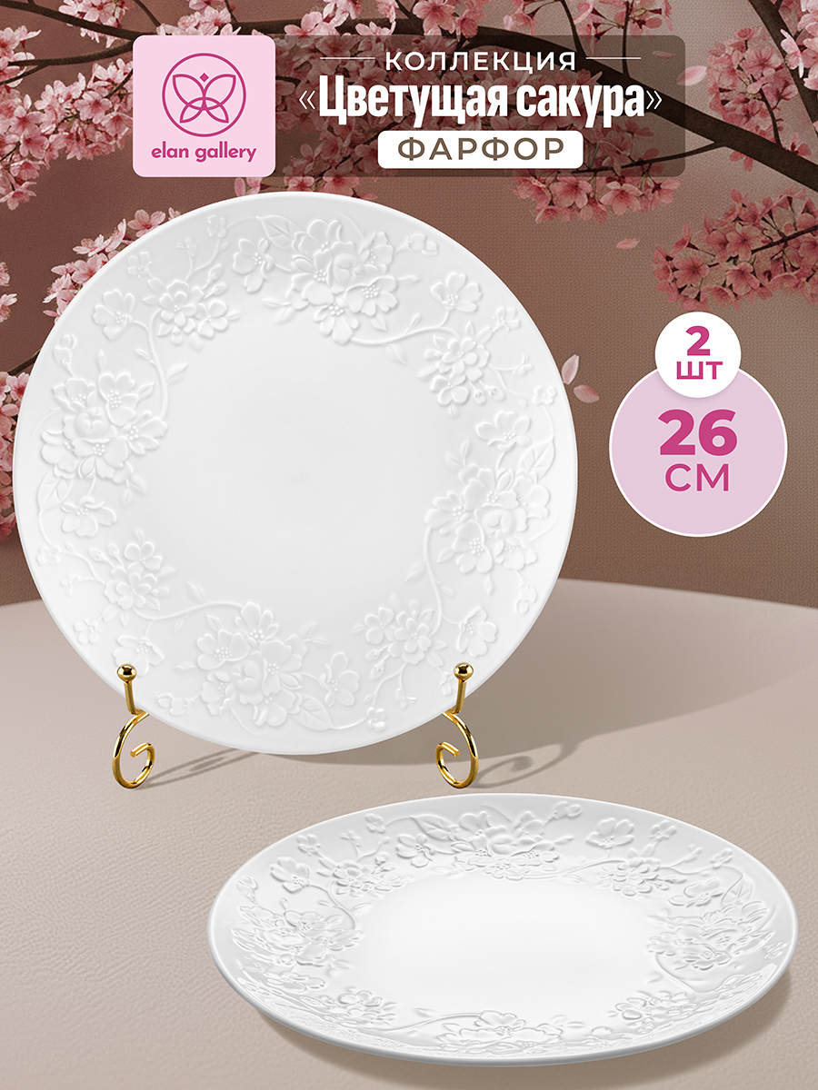 Набор 2 тарелок Elan Gallery "Цветущая сакура" выполнен из белого фарфора в классическом дизайне. Размер каждой тарелочки – 26х26х2,5 см. Посуда украшена рельефными узорами с цветами. Большие тарелки для подачи на стол ваших любимых блюд станут незаменимой вещью в доме. Набор отлично подойдёт для любых закусок, например, фруктов или нарезки. Каждая тарелка станет незаменимым помощником при сервировке завтрака, ужина или вторых блюд на обед. Эргономичная форма позволит разместить на них любую еду, от блинов до пасты. Фарфоровая посуда отличается от керамики повышенной плотностью. Фарфор не впитывает цвет продуктов и не деформируется от влаги, чему может быть подвержена керамическая посуда. Универсальный набор идеально впишется в любой интерьер вашей кухни и подойдёт при сервировке стола не только в будни, но и на праздник. Не рекомендуется применять абразивные моющие средства. Можно использовать в микроволновой печи и мыть в посудомоечной машине. Поставляется в картонной коробке с логотипом бренда – благодаря ей вам не потребуется дополнительная подарочная упаковка! Станет приятным подарком на любой праздник. Серия "Цветущая сакура" станет украшением любого кухонного инвентаря и позволит собрать сервиз в едином стиле!