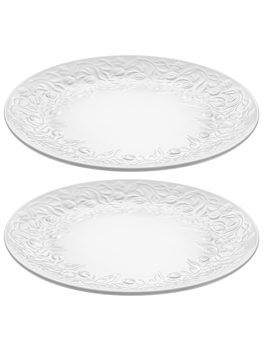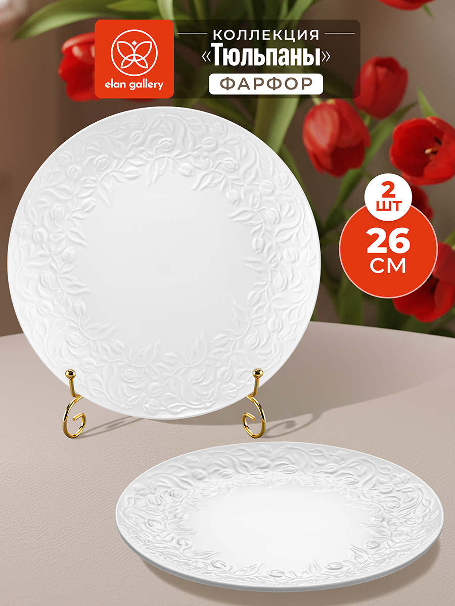 Набор 2 тарелок Elan Gallery "Тюльпаны" выполнен из белого фарфора в классическом дизайне. Размер каждой тарелочки – 26х26х2,5 см. Посуда украшена рельефными узорами с цветами. Большие тарелки для подачи на стол ваших любимых блюд станут незаменимой вещью в доме. Набор отлично подойдёт для любых закусок, например, фруктов или нарезки. Каждая тарелка станет незаменимым помощником при сервировке завтрака, ужина или вторых блюд на обед. Эргономичная форма позволит разместить на них любую еду, от блинов до пасты. Фарфоровая посуда отличается от керамики повышенной плотностью. Фарфор не впитывает цвет продуктов и не деформируется от влаги, чему может быть подвержена керамическая посуда. Универсальный набор идеально впишется в любой интерьер вашей кухни и подойдёт при сервировке стола не только в будни, но и на праздник. Не рекомендуется применять абразивные моющие средства. Можно использовать в микроволновой печи и мыть в посудомоечной машине. Поставляется в картонной коробке с логотипом бренда – благодаря ей вам не потребуется дополнительная подарочная упаковка! Станет приятным подарком на любой праздник. Серия "Тюльпаны" станет украшением любого кухонного инвентаря и позволит собрать сервиз в едином стиле!