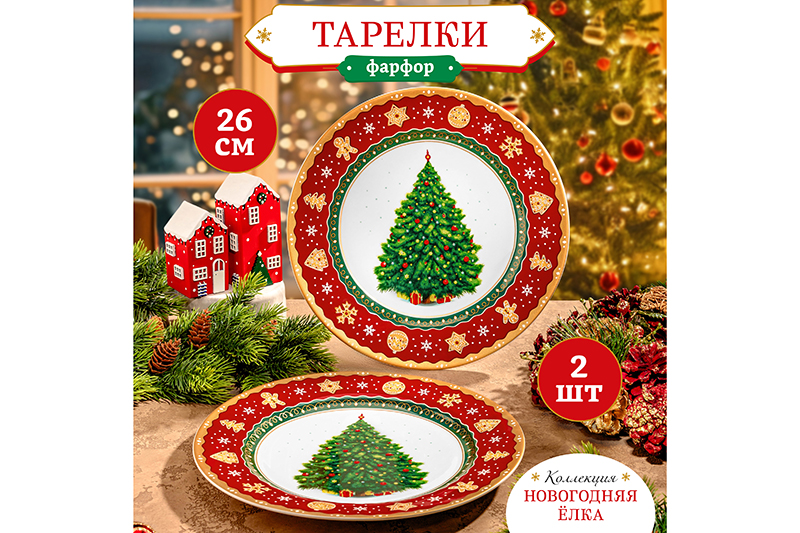 Набор тарелок обеденных 2 пр. 26*26*2 см "Новогодняя елка" красный узор, фарфор NEW BONE CHINA