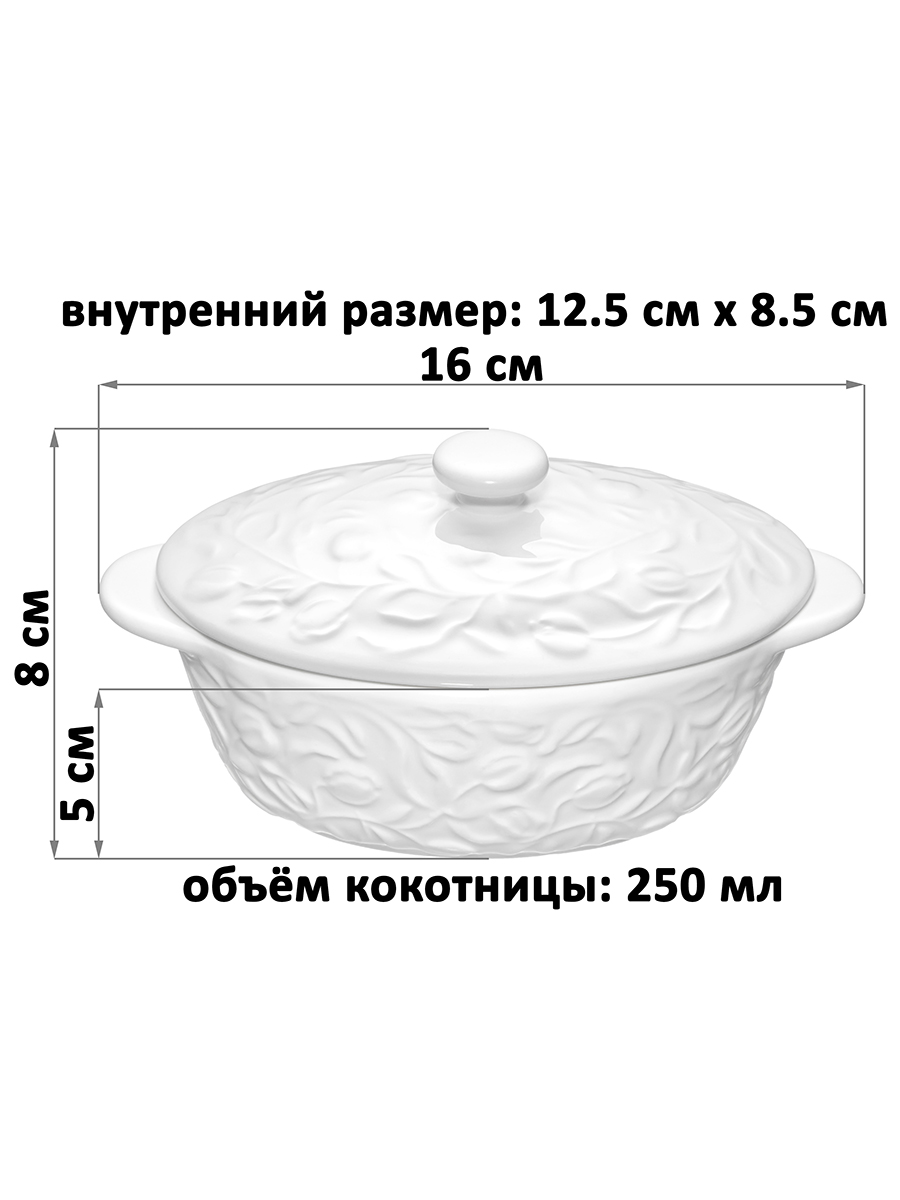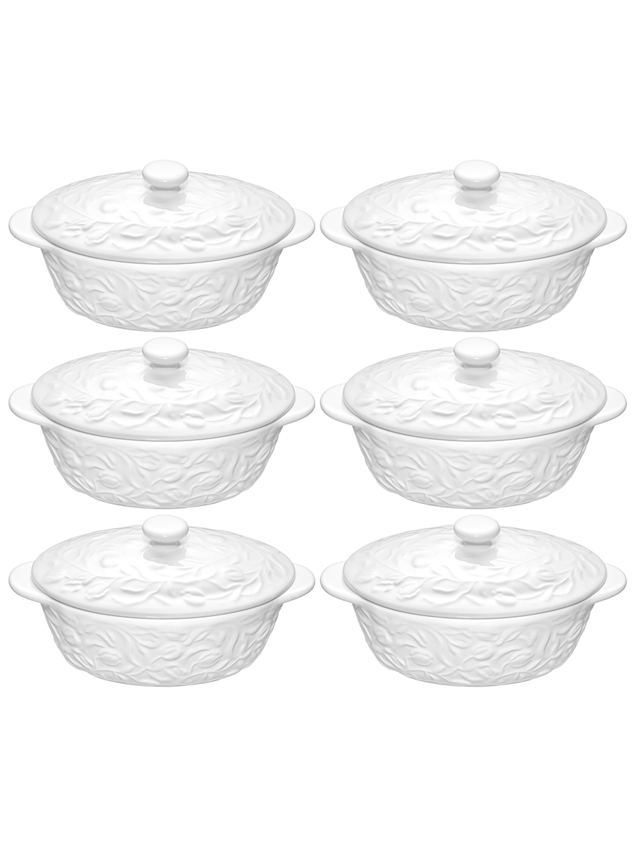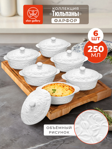 Набор 6 жюльенниц-кокотниц с крышками от Elan Gallery из серии "Тюльпаны" предназначен для эстетичной сервировки вашего стола. Размер каждой жюльенницы – 16х10х8 см, внутренний размер – 12,5х8,5х4,5 см, объём – 250 мл. Каждая кокотница выполнена из белого фарфора и украшена изысканным рельефным узором с цветами. Фарфор не впитывает цвет продуктов и легко отмывается, благодаря чему надолго сохранит свою белизну. Красивая формочка подойдёт для запекания душистого жюльена, а также приготовления кондитерских и кулинарных изделий. Эстетичную ёмкость можно тут же подавать на стол после приготовления благодаря удобным ручкам. Используйте горшочек в качестве сахарницы или солонки, наполните небольшим количеством специй, приправ и других сыпучих продуктов, чтобы всё необходимое всегда было под рукой. Подойдёт для выпекания порционных десертов, например, творожных запеканок и крем-брюле. Станет стильным дополнением стола на любом чаепитии. Благодаря лаконичному дизайну посуда впишется в интерьер любой квартиры, кухни и столовой. Беречь от механических повреждений и резких перепадов температур. Не рекомендуется применять абразивные моющие средства. Подойдёт для использования в посудомоечной машине, микроволновой печи и духовом шкафу при температуре до 230 градусов. Поставляется в картонной коробке с логотипом бренда – благодаря ей вам не потребуется дополнительная подарочная упаковка! Станет приятным подарком на любой праздник. Серия "Тюльпаны" станет украшением любого кухонного инвентаря и позволит собрать сервиз в едином стиле!