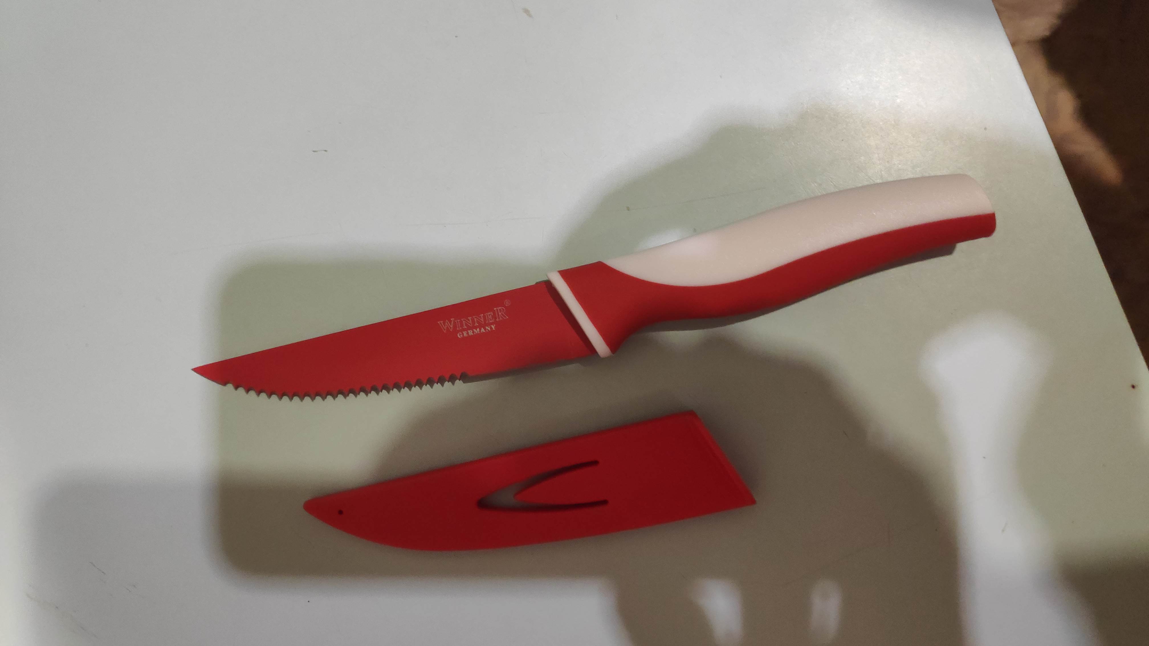 21,4см. Лезвие 1,2мм с цв. полимерным покрытием для предотвращения прилипания продуктов, ручка из прорезиненного пластика с антибакт. покрытием, ножны. 3 цв.(красный, синий, черный). Состав: нержав. сталь.