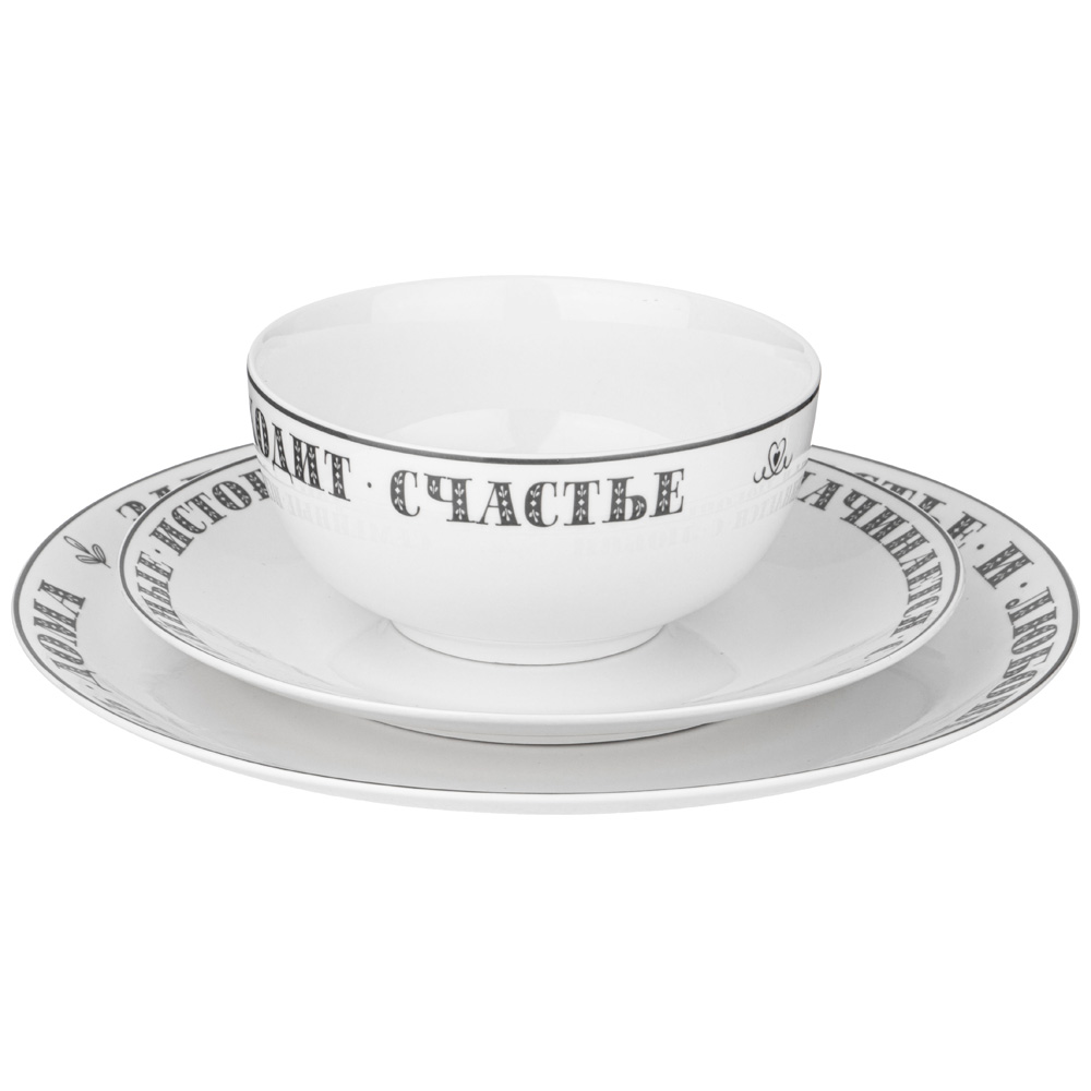 Столовый сервиз состоит из 18 предметов и рассчитан на 6 персон. В набор посуды фарфор, посуда для сервировки входят тарелка обеденная 27 см - 6 шт., тарелка закусочная (тарелка десертная) 20,5 см - 6 шт., салатник (суповая тарелка) диаметр 14 см объем 600 мл - 6 шт. Сервиз на 6 персон подойдет как для ежедневного использования, так и для торжественных случаев. Посуда прошла сертификацию. Безопасна для контакта с пищевыми продуктами. Можно использовать в микроволновой печи можно мыть в посудомоечной машине с применением мягких неабразивных средств. Набор посуды надёжно упакован. Набор столовой посуды сервиз отличный подарок на день рождения новый год рождество для мамы бабушки свекрови тещи на новоселье. Подарочная коробка подарочная упаковка. Фарфоровый набор посуды предназначен для сервировки стола и подачи блюд. Столовая посуда подойдет как для ежедневного использования так и для торжественных случаев. Набор тарелок подойдет для украшения праздничного новогоднего стола. Посуда из фарфора отличается прочностью надежностью гигиеничностью и долгим сроком службы. Тарелки из фарфора устойчивы к появлению царапин и резким перепадам температур. Столовые сервизы из фарфора прочные и хорошо сохраняют тепло. Суповую тарелку (салатник) можно использовать под горячие первые блюда салаты закуски каши гранолу мюсли. Плоские мелкие тарелки можно использовать под вторые блюда горячие и холодные блюда и закуски десерты салаты. Столовый набор дополнит Ваш дом уютом и гармонией благодаря стильному дизайну. Современный обеденный сервиз также может использоваться для подачи десертов.