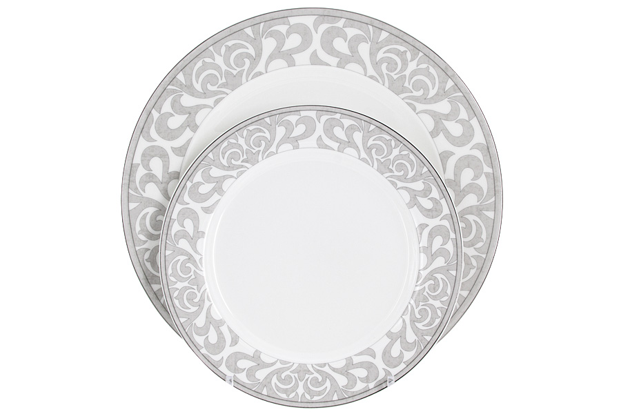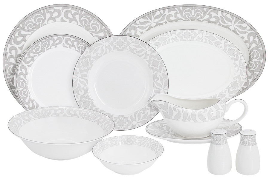 Комплектность: 6 обеденных тарелок 27 см, 6 суповых тарелок 21 см, 6 закусочных тарелок 21 см, 1 салатник 23 см, 2 салатника 16 см, 1 блюдо 36 см, 1 блюдо 26 см, соусник+блюдо под него, набор для специй