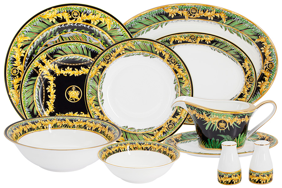 Комплектность: 6 обеденных тарелок 27 см, 6 суповых тарелок 20,5 см, 0,25 л, 6 закусочных тарелок 21 см, салатник 23 см, 1,2 л, 2 салатника 16 см, 0,7 л, 1 блюдо 36 см, 1 блюдо 26 см, соусник 0,21 л, блюдо под соусник 25х16 см, перечница, солонка
