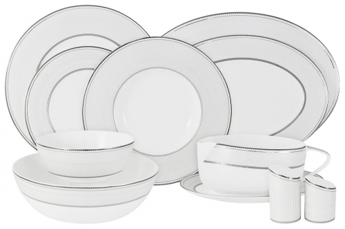 Комплектность: 6 обеденных тарелок 27 см, 6 суповых тарелок 20,5 см, 0,3 л, 6 закусочных тарелок 21 см, 1 салатник 20,5 см, 1,85 л, 2 салатника 14,5 см, 0,75л, 1 блюдо 36см, 1 блюдо 26 см , соусник 0,4 л, блюдо под соусник, солонка, перечница