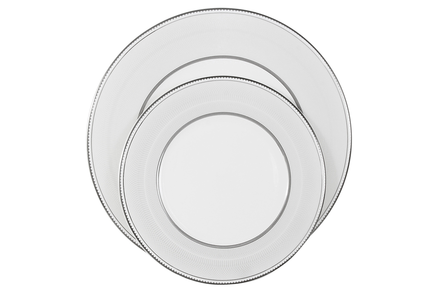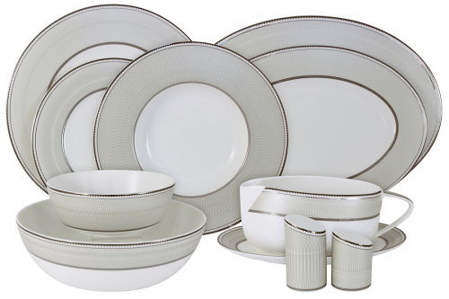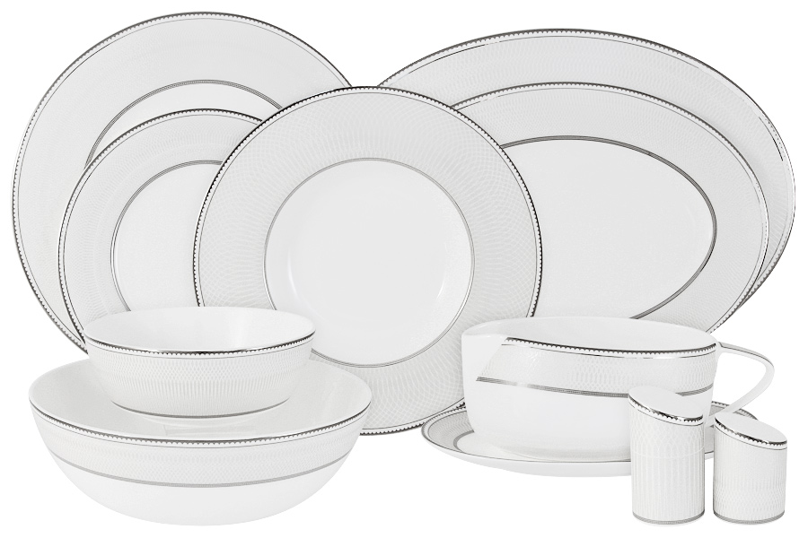 Комплектность: 6 обеденных тарелок 27 см, 6 закусочных тарелок 20 см, 6 суповых тарелок 22.5 см, 0,4 л, 1 салатник 22.5 см, 1,7 л, 2 салатника 15 см, 0,45 л,1 блюдо 36 см, 1 блюдо 25 см, соусник 0,5 л, блюдо под соусник, солонка, перечница
