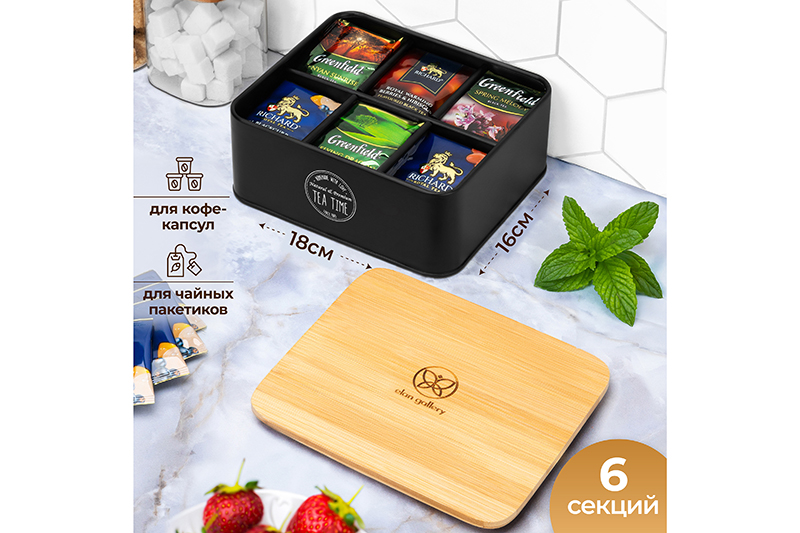 Органайзер для хранения чайных пакетиков от Elan Gallery – это идеальное решение для любителей чая. Стильная коробочка элегантного чёрного цвета выполнена из металла, имеет бамбуковую крышку. Размер 18,5х16х8 см. Имеет полностью съёмную крышечку и 6 одинаковых секций внутри. Размер каждой внутренней ячейки – 5,5х7,5х6,5 см. Высота контейнера без крышки 7 см. Металл в составе изделия обеспечивает его долговечность, а натуральный бамбук придаёт стиля и природной гармонии. Металлические стенки украшены лаконичной надписью "Tea time" ("Время чая"), а прямоугольная крышка – логотипом бренда. Благодаря стильному органайзеру с отсеками ингредиенты для заваривания любимого напитка будут всегда под рукой! Добавьте домашнему интерьеру стиля и комфорта. Крышечка защищает чайные пакеты от пыли и влаги. Ёмкость можно использовать для хранения капсул для кофемашины, пакетиков с растворимым кофе, фильтр-пакетов с травами. Удобно для пуэра в таблетках. Подойдёт в роли секционной банки для хранения разных видов чая. Храните сорта зелёного и чёрного чая в одной баночке и наслаждайтесь ежедневной дегустацией! Эта функциональная подставка станет предметом декора для интерьера вашей столовой. Шкатулка для чая – чудесный сюрприз на любой праздник для любителей чаепитий. Поставляется в красочной картонной коробке, поэтому не потребуется подарочная упаковка. Нельзя использовать абразивные моющие средства. Нельзя использовать в посудомоечной машине и микроволновой печи. Сделайте оригинальный подарок себе или близким – маленький ящик для чайных пакетиков украсит вашу кухню и поможет хранить всё необходимое в одном месте. /