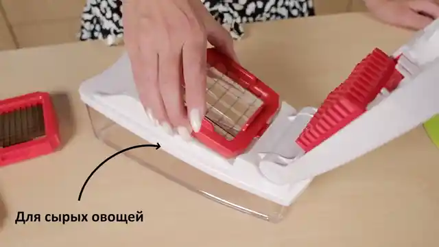 Нарезанный продукт попадает в контейнер, что гарантирует чистоту рабочей поверхности и отсутствие запаха при нарезке лука.
