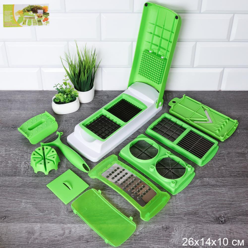Металл, пластик Многофункциональная роторная овощерезка является универсальным кухонным приспособлением. У неё множество разнообразных насадок, за счёт которых она не только измельчает и придаёт нужную форму овощам и фруктам. Не только кубики и брусочки можно получить с помощью данного аппарата, но более интересные по форме ломтики. Фигурная нарезка, характерной особенностью которой является видоизменённая поверхность ломтика, позволит значительно преобразить даже самый обычный салат.