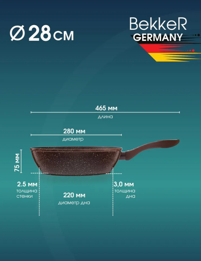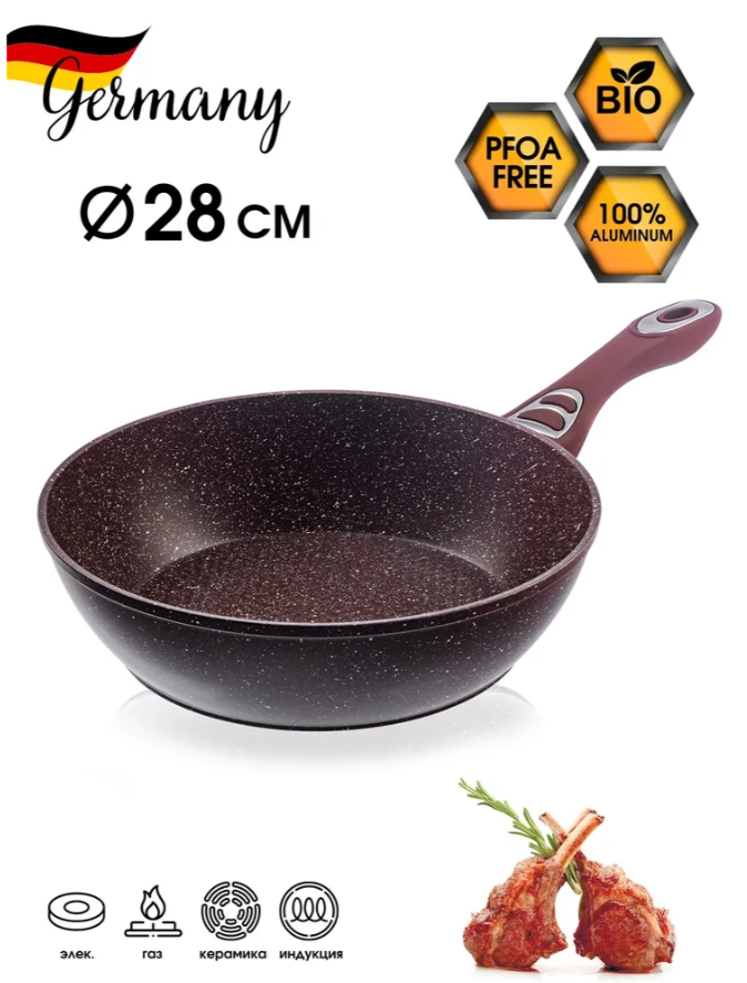 28см (2,5/3мм), высота 7,5 см, внутри 3-х слойное мраморное антиприг. покрытие с рельефом , снаружи: 3-х слойное жаропрочн. мраморное покрытие.Ручка с покрытием soft touch в цвет сковороды. Подходит для использов. на индукционной плите. Не подходит для посудомоечной машины. Без инд. упаковки. Состав: кованый алюминий.
