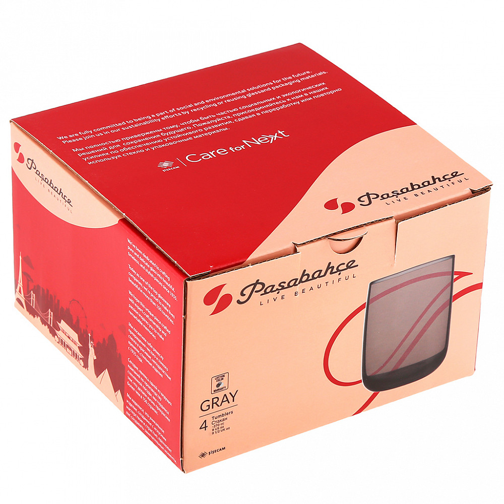 Набор стакановПашабахче Грэй– стильное решение для сервировки стола и ежедневного использования. В набор включается 4 стакана, одинаковых по размеру и дизайну. Такие стаканы отлично подходят для воды, сока, лимонада, коктейлей или компота. Используемое стекло отличается высокой прочностью, а также чистотой производства. Стильный серый дизайн отлично подойдёт для строгих интерьеров, использовать такие стаканы можно дома, в барах, кафе и других заведениях.Особенности:• объём стаканов 270 мл;• широкий диаметр изделий;• отличный дизайн без лишних декоративных элементов.