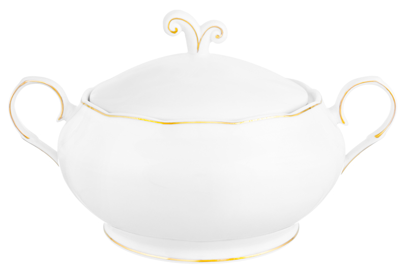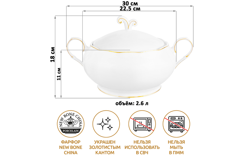 Многофункциональное глубокое блюдо с крышкой из серии «Белая с золотом» можно использовать как пельменницу, супницу или бульонницу. Размер изделия – 30х22,5х18 см, объём – 2,6 литра. Выполнено из фарфора нового поколения new bone china, сочетающего в себе изящность и высокую прочность. За счёт гладкости изделия легко отмываются, поэтому сохраняют привлекательный вид и практичны в использовании. Плотная структура материала позволяет посуде дольше сохранять температуру блюд и напитков. От других видов костяного фарфора new bone china отличается большей экологичностью в производстве. Белая фарфоровая посуда с элегантным золотистым кантом станет изящным дополнением интерьера любой кухни, столовой и гостиной. Она поможет эстетично подавать к столу аппетитные борщи, ароматные щи, домашние пельмени и другие блюда! Фигурная супница хорошо сохраняет тепло блюд благодаря крышке, а за счёт ручек она удобна для переноски. Летом суповая чаша подойдёт для красивой подачи окрошки – в роли окрошницы, а также позволит наслаждаться горячим супом круглый год. Подайте к столу лапшу, вареники или классический куриный бульон. Благодаря изящному дизайну подойдёт для сервировки праздничного стола – угостите своих гостей ароматным пловом. Не рекомендуется применять абразивные моющие средства. Не подходит для использования в микроволновой печи и посудомоечной машине. Поставляется в картонной коробке. Фарфоровая сервировочная посуда послужит оригинальным подарком для хозяйки, ценящей не только практичность, но и привлекательность. Серия «Белая с золотом» станет украшением любого кухонного инвентаря и позволит собрать сервиз в едином стиле!