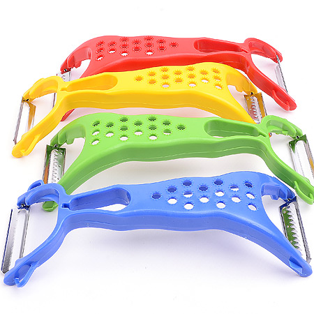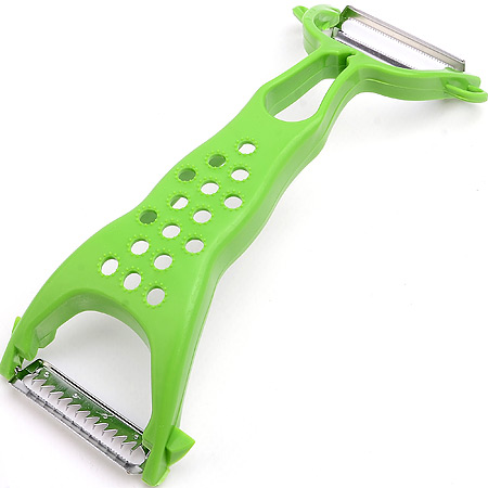 Компактный и легкий прибор вбирает в серя сразу несколько полезных инструкментов. Овощечистка имеет 2 ножа-пиллета, которые прекрасно подойдет для очистки корнеплодов. Один из ножей имеет лезвие с зубчиками, для нарезки моркови для салата по-корейски. На ручке овощерезки удобно размещается небольшая терка для чеснока. По бокам имеется несколько специальных ножей-усиков для удаления глазков картофеля. Острые лезвия овощерезки изготовлены из высококачественной нержавеющей стали, будут долго оставаться острыми. Один прибор позволит значительно упростить работу и разгрузить пространство. Овощерезку легко мать, она занимает мало места.