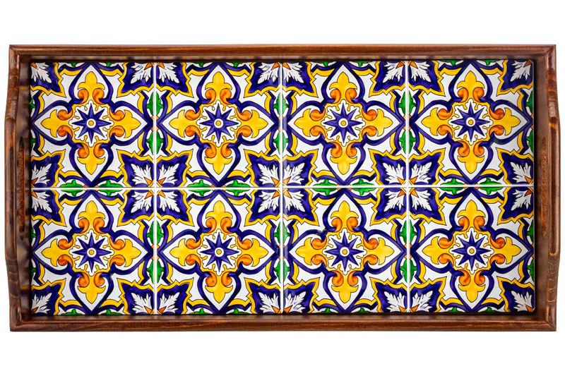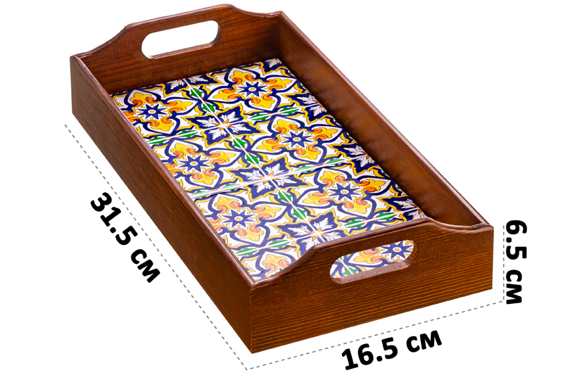 Прямоугольный поднос «Мозаика» от Elan Gallery поможет в эстетичной сервировке любимых блюд. Размер изделия – 31,5х16,5х6,5 см, толщина дна – 1,5 см. Высокие бортики выполнены из дерева, дно сложено из декоративных керамических плиток с ярким орнаментом. Каждое изделие изготавливается вручную, поэтому точный вид орнамента может варьироваться. Поднос идеально подойдёт для эстетичной подачи разнообразных угощений. Заполните его сервировочной посудой – прочные ручки помогут перенести содержимое между комнатами. Это изящный способ подать шашлык, сыр, фрукты и вино для романтического вечера. Преподнесите завтрак в постель с любимым кофе, проведите уютные перекусы на веранде или устройте неторопливую чайную церемонию. Многофункциональный поднос также послужит в качестве универсального органайзера. В спальне храните в нём косметику, украшения и парфюмерию. На столе заполните канцелярией, блоками записных листов, баночками с аромадиффузорами. Это идеальный вариант для создания декоративной композиции с фигурками, свечами и другими аксессуарами. Поднос станет оригинальным подарком для тех, кто ценит необычные вещи. Не рекомендуется применять абразивные моющие средства. Нельзя замачивать, не использовать в посудомоечной машине и микроволновой печи. Поставляется в дизайнерской картонной коробке – благодаря ей вам не потребуется дополнительная подарочная упаковка. В коллекции бренда Элан Галерея представлено много красивой посуды и стильных товаров для дома – выберите варианты на свой вкус!