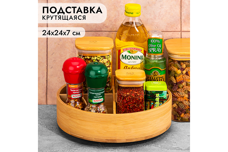 Крутящаяся подставка размером 24х24х7,2 см подойдет для организации хранения различных мелочей на кухне или в столовой. Имеет четыре секции. Органайзер выполнен из натурального бамбука. Вращающаяся подставка поможет навести порядок на вашей кухне и держать всё необходимое под рукой. Разместите на ней баночки со специями и приправами, столовые приборы, ёмкости с крупами и бутылки с маслом. На подставке можно организовать хранение различных кухонных принадлежностей. Не рекомендуется применять абразивные моющие средства. Не рекомендуется использовать в микроволновой печи (СВЧ) и посудомоечной машине (ПММ). Бамбуковая подставка станет функциональным дополнением интерьера вашей кухни и приятным подарком для любой хозяйки.