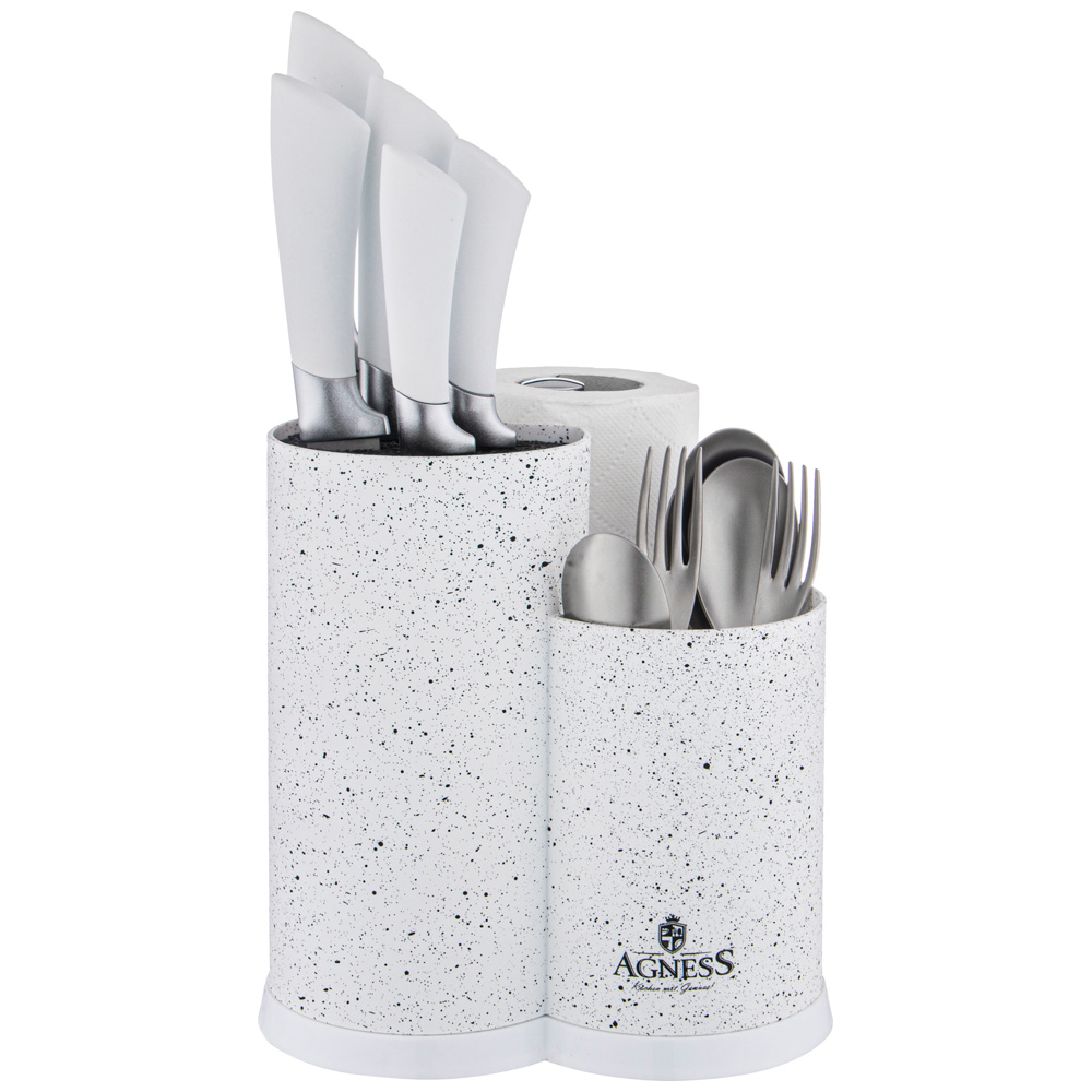 Подставка для ножей – необходимый аксессуар на каждой кухне. Подставка AGNESS с наполнителем и держателем для полотенец - это отличное решение для компактного хранения кухонных принадлежностей. Подставка легко и удобно решает проблему хранения ножей, защищая лезвия ножей от загрязнения. Дополнительный отсек можно использовать для хранения различных кухонных аксессуаров. Подставка для кухонных принадлежностей подходит для стандартных бумажных полотенец в рулонах.