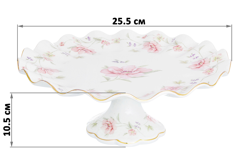 Подставка под торт из серии «Диана» от Elan Gallery предназначена для эстетичной сервировки вашего стола. Размер изделия – 25,5х25,5х10,5 см. Высота ножки – 8 см. Выполнена из фарфора нового поколения new bone china, сочетающего в себе изящность и высокую прочность. Такие изделия легко отмываются, поэтому сохраняют привлекательный вид и практичны в использовании. От других видов костяного фарфора new bone china отличается большей экологичностью в производстве. Поверхность изделия украшает воздушный цветочный рисунок и элегантное золотое окаймление. Используйте подставку для подачи к столу ваших любимых десертов. Красиво положите на неё бутерброды из хлеба и сырной или мясной нарезки, чтобы подкрепиться на завтрак. Разложите роллы, салаты, свежие овощи и фрукты, подайте конфеты или другие сладости. Она идеально пойдёт для торта или пирога. Тортовница с волнистым краем станет уникальным дополнением вашего кухонного инвентаря. Благодаря нежному дизайну она впишется в интерьер любой кухни, гостиной или столовой. Не рекомендуется применять абразивные моющие средства. Не использовать в посудомоечной машине и микроволновой печи. Поставляется в дизайнерской картонной коробке – благодаря ей вам не потребуется дополнительная подарочная упаковка. Фарфоровая сервировочная посуда будет оригинальным подарком для хозяйки, ценящей не только практичность, но и привлекательность. Серия «Диана» от бренда Элан Галерея подарит вам ощущение мечтательной лёгкости!
