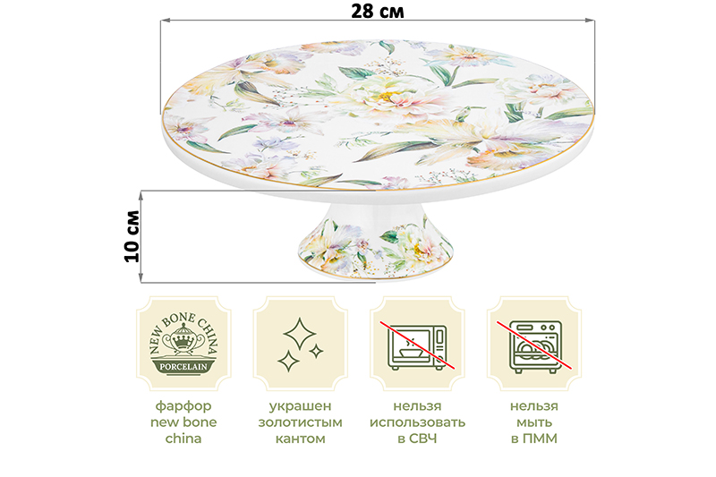 Круглое блюдо на ножке для торта, выпечки и капкейков от Elan Gallery из серии "Корнелия" 28х28х10 см выполнено фарфора нового поколения new bone china. Высота ножки – 9 см. Материал сочетает в себе изящность и высокую прочность. За счёт гладкости изделия легко отмываются, поэтому сохраняют привлекательный внешний вид и практичны в использовании. От костяного фарфора new bone china отличается большей экологичностью в производстве. Поверхность изделия овивают обворожительные белые пионы. Они выполнены в манере, вдохновлённой акварельным рисунком. Тонкая золотистая окантовка служит деликатным акцентом и подчёркивает их изысканность. Тарелка станет гармоничным дополнением вашего стола в будни и на праздник. Используйте сервировочное блюдо для конфет или фруктов. Оно будет смотреться наряднее простой подложки для торта! Декоративная тортовница подойдет для любых десертов, таких как капкейки, печенье и пирожные. Тарелочка незаменима для изящной сервировки домашнего пирога и любых сладостей, а также сыра и мясной нарезки! Вы сможете красиво подать гостям бутерброды, канапе и даже суши и роллы. Используйте тарелку для закусок или в роли фруктовницы на празднике. На Пасху тортница подойдёт для кулича. Фарфор не впитывает цвет продуктов и не деформируется от влаги, чему может быть подвержена керамика. Не рекомендуется применять абразивные моющие средства. Нельзя мыть в посудомоечной машине и использовать в микроволновой печи. Поставляется в стильной картонной коробке. Станет настоящим украшением вашего дома и чудесным подарком на любой праздник. Благодаря красочной коробочке не понадобится дополнительная подарочная упаковка! Серия "Корнелия" от бренда Элан Галерея добавит вашему кухонному инвентарю лёгкости и элегантности, преобразив любую сервировку!