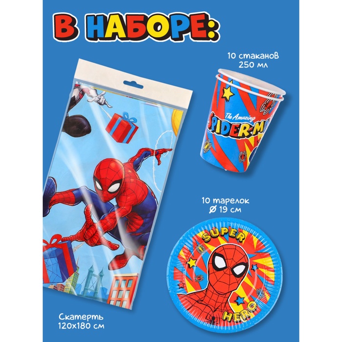 Посуда бумажная одноразовая «Человек-паук», на 10 персон, стаканы, тарелки, скатерть
