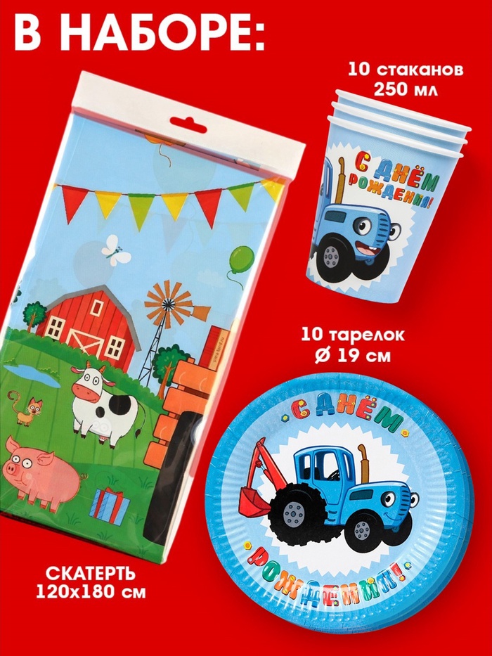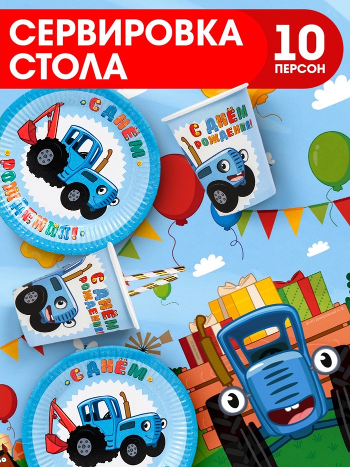 Посуда одноразовая бумажная для праздника, Синий трактор, на 10 персон
