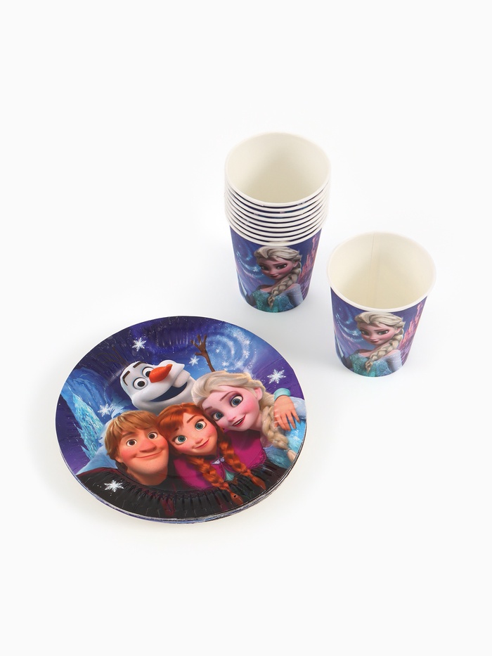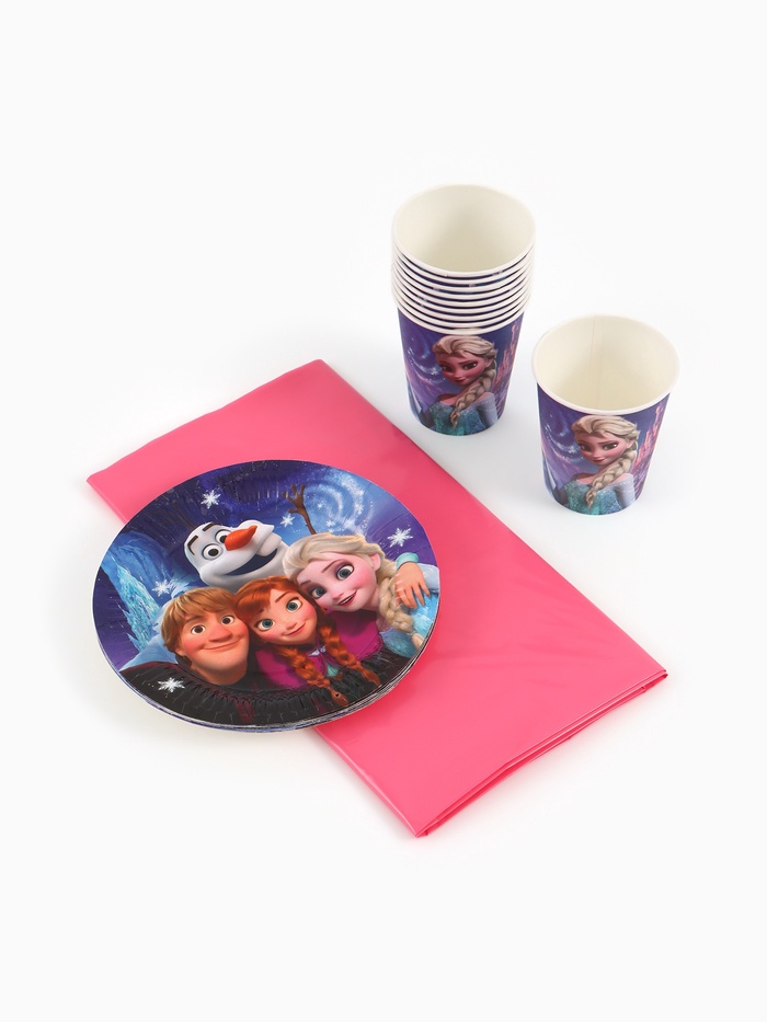 Посуда одноразовая бумажная на 10 персон: стаканы, тарелки, скатерть, Холодное сердце