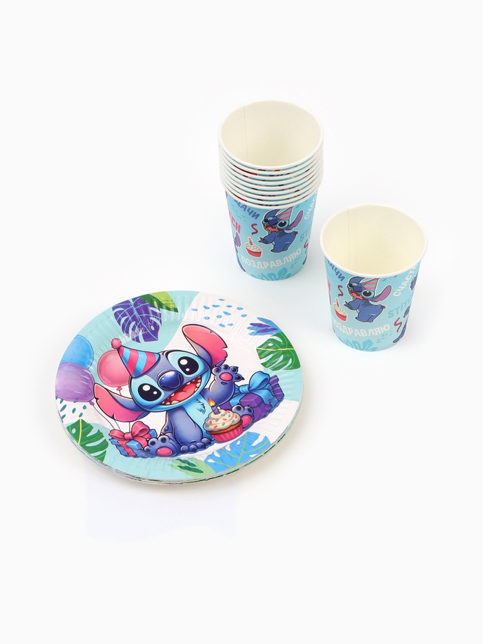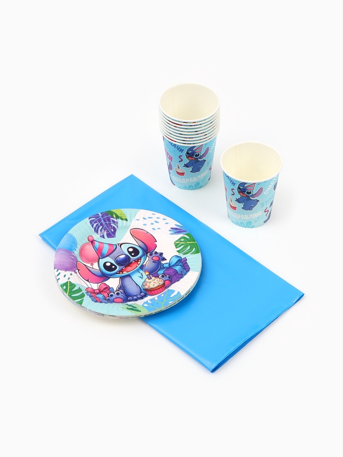 Посуда одноразовая бумажная на 10 персон: стаканы, тарелки, скатерть, Стич