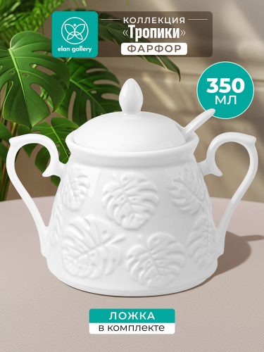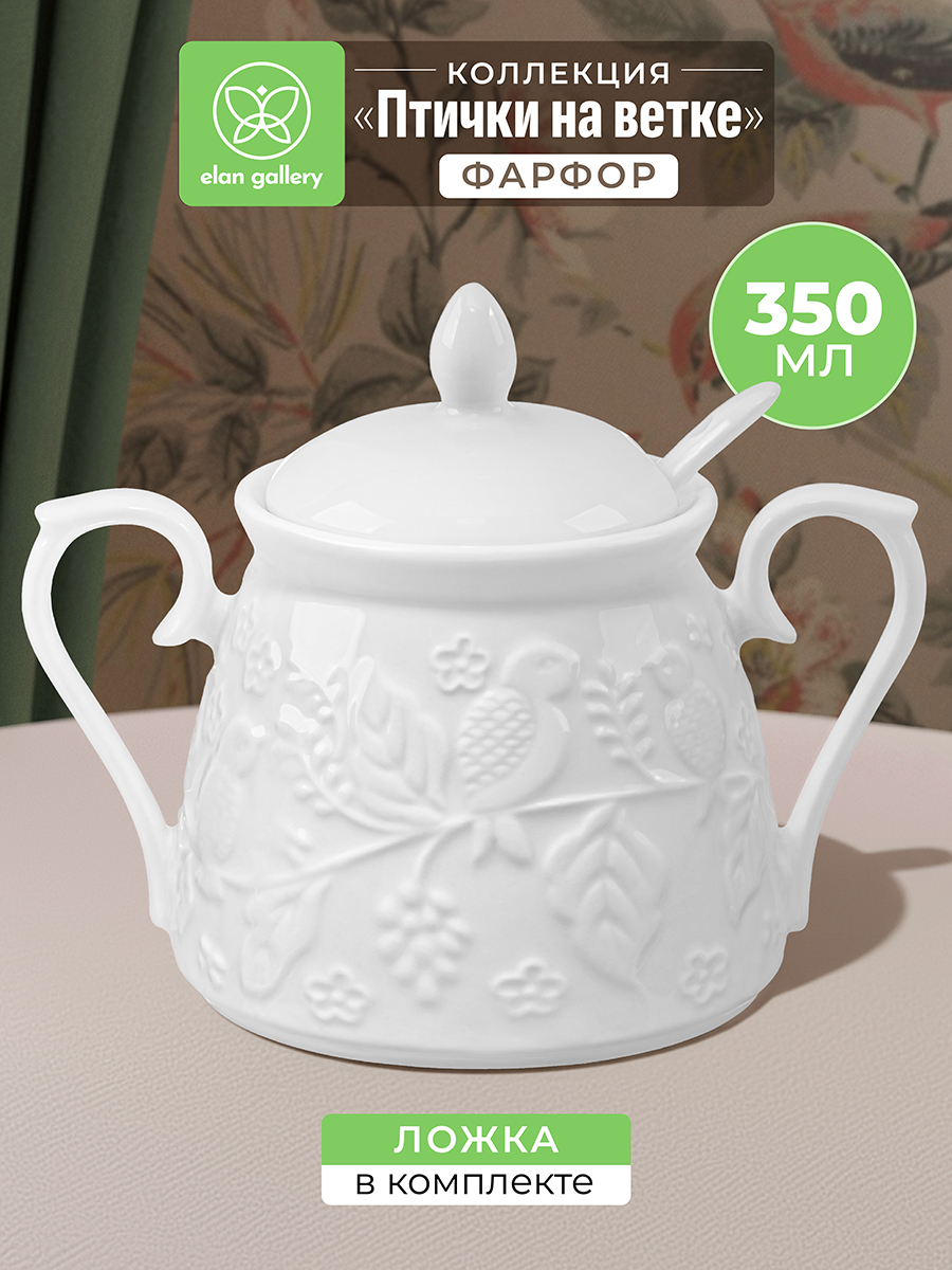 Сахарница из серии «Птички на ветке» от Elan Gallery предназначена для эстетичной сервировки вашего стола. Размер ёмкости – 14,5х10х11,5 см, объём – 350 мл. Выполнена из высококачественного белого фарфора. Он не впитывает цвет продуктов и легко отмывается, благодаря чему надолго сохранит свою белизну. Поверхность украшают рельефные узоры в виде лиственных веточек и сидящих на них птичек. Поставляется в комплекте с фарфоровой ложкой размером 13х2,5 см. Декоративная баночка добавит особого шарма вашему кухонному инвентарю. Она подойдёт для хранения не только сахара, но и соли, специй и приправ. Засыпьте внутрь чай или кофе, чтобы в любой момент заварить свежий напиток. Подайте её вместе с горячими блюдами, чтобы каждый мог приправить пищу по своему вкусу. Стильное изделие также можно приспособить под варенье, мёд или икру. Маленькая ложечка позволит набрать необходимое количество продуктов. Она компактно помещается в баночке благодаря выемке на крышке. Изделие с двумя ручками удобно переносить и подавать к столу. Не рекомендуется применять абразивные моющие средства. Подходит для использования в посудомоечной машине и микроволновой печи. Поставляется в дизайнерской картонной коробке – благодаря ей вам не потребуется дополнительная подарочная упаковка. Фарфоровая сервировочная посуда будет оригинальным подарком для хозяйки, ценящей не только практичность, но и привлекательность. Серия «Птички на ветке» от бренда Элан Галерея станет украшением любого кухонного инвентаря и позволит собрать красивый сервиз в едином стиле!