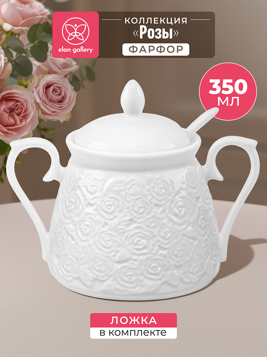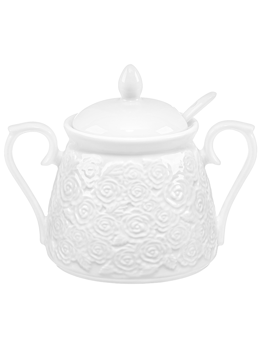 Сахарница из серии «Розы» от Elan Gallery предназначена для эстетичной сервировки вашего стола. Размер ёмкости – 14,5х10х11,5 см, объём – 350 мл. Выполнена из высококачественного белого фарфора. Он не впитывает цвет продуктов и легко отмывается, благодаря чему надолго сохранит свою белизну. Поверхность изделия украшают рельефные узоры в виде пышных бутонов роз. Поставляется в комплекте с фарфоровой ложкой размером 13х2,5 см. Декоративная баночка добавит особого шарма вашему кухонному инвентарю. Она подойдёт для хранения не только сахара, но и соли, специй и приправ. Засыпьте внутрь чай или кофе, чтобы в любой момент заварить свежий напиток. Подайте её вместе с горячими блюдами, чтобы каждый мог приправить пищу по своему вкусу. Стильное изделие также можно приспособить под варенье, мёд или икру. Маленькая ложечка позволит набрать необходимое количество продуктов. Она компактно помещается в баночке благодаря выемке на крышке. Изделие с двумя ручками удобно переносить и подавать к столу. Не рекомендуется применять абразивные моющие средства. Подходит для использования в посудомоечной машине и микроволновой печи. Поставляется в дизайнерской картонной коробке – благодаря ей вам не потребуется дополнительная подарочная упаковка. Фарфоровая сервировочная посуда будет оригинальным подарком для хозяйки, ценящей не только практичность, но и привлекательность. Серия «Розы» от бренда Элан Галерея станет украшением любого кухонного инвентаря и позволит собрать красивый сервиз в едином стиле!