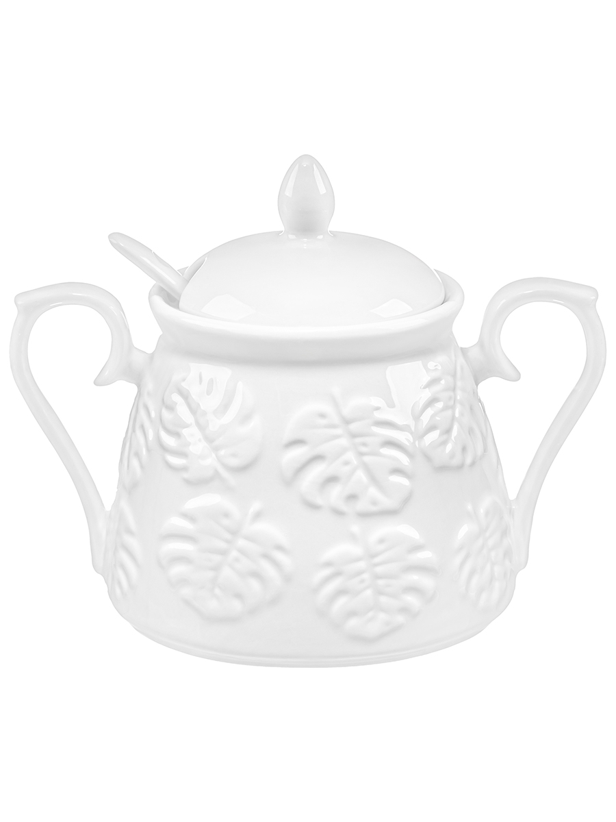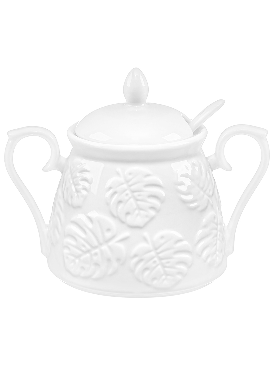 Сахарница из серии «Тропики» от Elan Gallery предназначена для эстетичной сервировки вашего стола. Размер ёмкости – 14,5х10х11,5 см, объём – 350 мл. Выполнена из высококачественного белого фарфора. Он не впитывает цвет продуктов и легко отмывается, благодаря чему надолго сохранит свою белизну. Поверхность украшена рельефным узором в виде тропических листьев. Поставляется в комплекте с фарфоровой ложкой размером 13х2,5 см. Декоративная баночка добавит особого шарма вашему кухонному инвентарю. Она подойдёт для хранения не только сахара, но и соли, специй и приправ. Засыпьте внутрь чай или кофе, чтобы в любой момент заварить свежий напиток. Подайте её вместе с горячими блюдами, чтобы каждый мог приправить пищу по своему вкусу. Стильное изделие также можно приспособить под варенье, мёд или икру. Маленькая ложечка позволит набрать необходимое количество продуктов. Она компактно помещается в баночке благодаря выемке на крышке. Изделие с двумя ручками удобно переносить и подавать к столу. Не рекомендуется применять абразивные моющие средства. Подходит для использования в посудомоечной машине и микроволновой печи. Поставляется в дизайнерской картонной коробке – благодаря ей вам не потребуется дополнительная подарочная упаковка. Фарфоровая сервировочная посуда будет оригинальным подарком для хозяйки, ценящей не только практичность, но и привлекательность. Серия «Тропики» от бренда Элан Галерея станет украшением любого кухонного инвентаря и позволит собрать красивый сервиз в едином стиле!