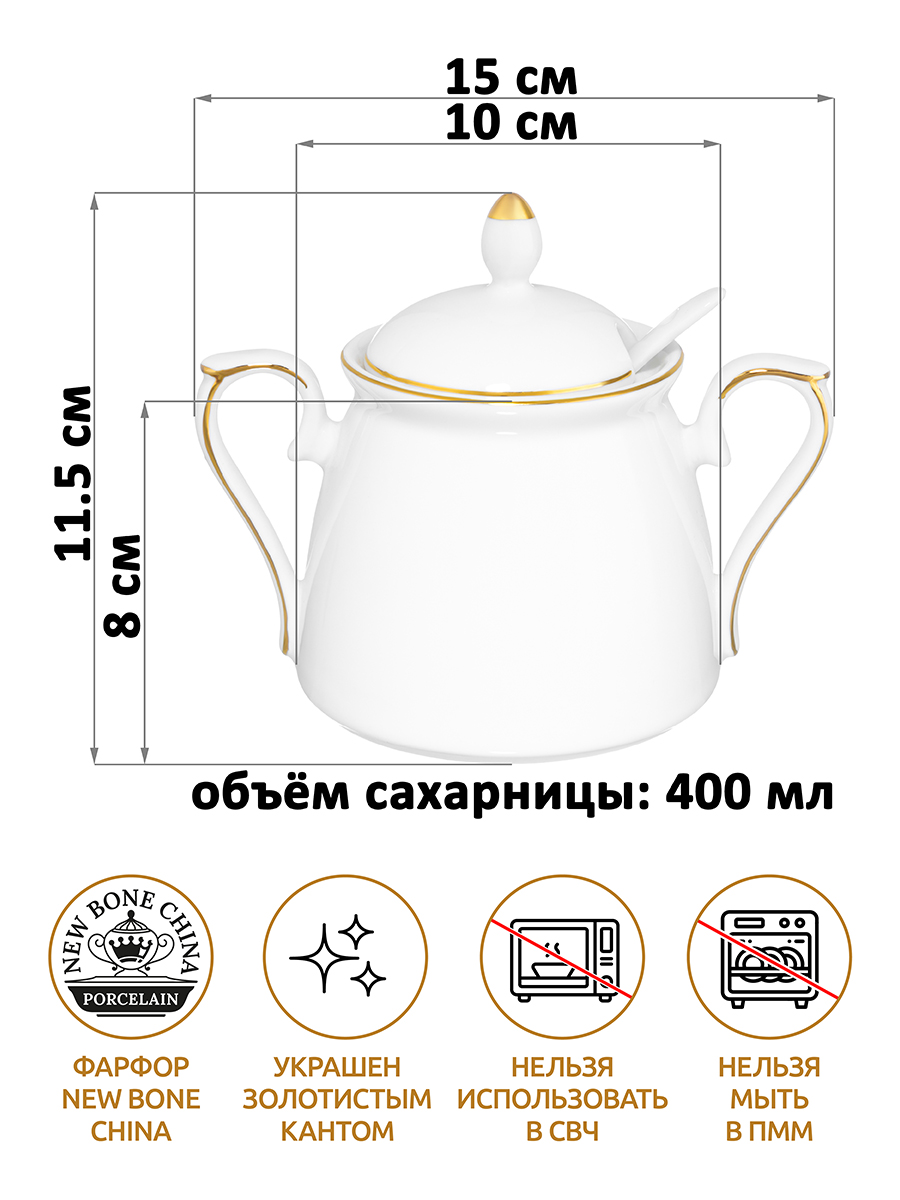 Сахарница 400 мл 15*10*11,5 см "Белая с золотом" с ложкой NEW BONE CHINA