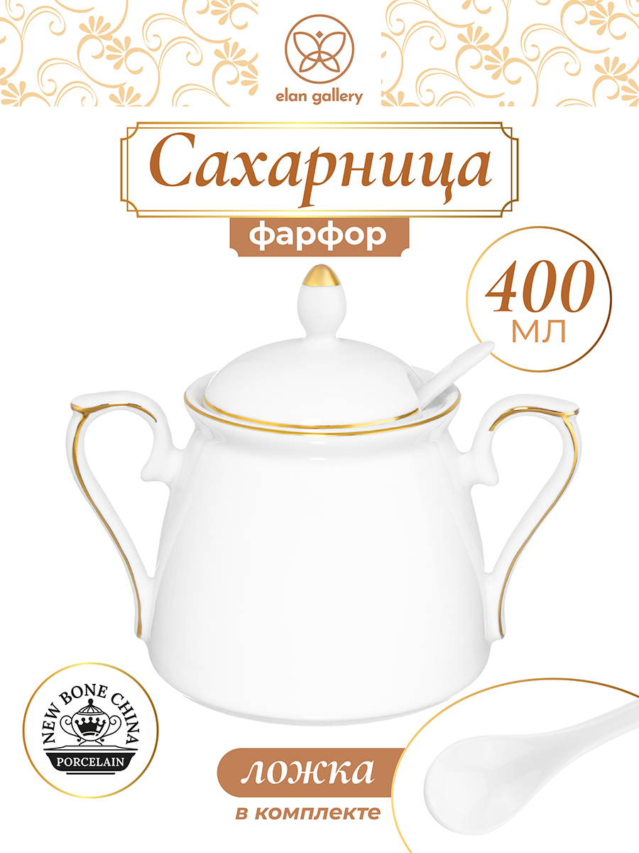 Сахарница с ложкой из серии «Белая с золотом» от Elan Gallery предназначена для эстетичной сервировки вашего стола. Размер изделия – 15х10х11,5 см, объём – 400 мл. Выполнена из фарфора нового поколения new bone china, сочетающего в себе изящность и высокую прочность. Такие изделия легко отмываются, поэтому сохраняют привлекательный вид и практичны в использовании. От других видов костяного фарфора new bone china отличается большей экологичностью в производстве. Белая фарфоровая посуда с элегантным золотистым кантом станет изящным дополнением интерьера любой кухни, столовой и гостиной. Ёмкость подойдёт для хранения не только сахара, но и соли, специй и приправ. Засыпьте внутрь чай или кофе, чтобы в любой момент заварить свежий напиток. Подайте её вместе с горячими блюдами, чтобы каждый мог приправить пищу по своему вкусу. Эстетичную ёмкость также можно приспособить под варенье, мёд или икру. Маленькая фарфоровая ложечка позволит удобно набрать необходимое количество продуктов. Она компактно помещается в баночке благодаря выемке на крышке. Не рекомендуется применять абразивные моющие средства. Не использовать в посудомоечной машине и микроволновой печи. Поставляется в дизайнерской картонной коробке – благодаря ей вам не потребуется дополнительная подарочная упаковка. Фарфоровая сервировочная посуда будет оригинальным подарком для хозяйки, ценящей не только практичность, но и привлекательность. Серия «Диана» от бренда Элан Галерея подарит вам ощущение мечтательной лёгкости!