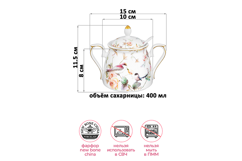 Сахарница 400 мл 15*10*11,5 см "Певчие птички" + ложка NEW BONE CHINA, фарфор