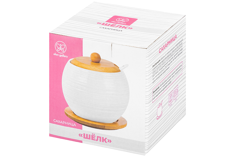 Сахарница Elan Gallery "Шёлк" объёмом 450 мл с ложкой выполнена из белого фарфора и украшена изящным рельефным узором. Общий размер набора – 10,5х10,5х10,5 см. Крышка и подставка баночки выполнены из натурального бамбука. Размер сахарницы без крышки и подставки – 10,5х10,5х9 см. Ёмкость подойдёт для хранения сахара, а также других продуктов, таких как варенье, мёд и даже икра. Фарфоровая баночка с ложечкой станет отличным элементом декора вашей кухни! Можно использовать для хранения специй и приправ, чтобы во время приготовления пищи все было под рукой. Без бамбуковых крышки и подставки можно использовать в микроволновой печи и посудомоечной машине. Изделия из бамбука нельзя замачивать! Поставляется в стильной картонной упаковке. Подарочная фарфоровая баночка порадует ваших близких на любой праздник. Кухонный инвентарь с рельефным рисунком станет незаменимым помощником при сервировке стола и предметом декора вашего дома!