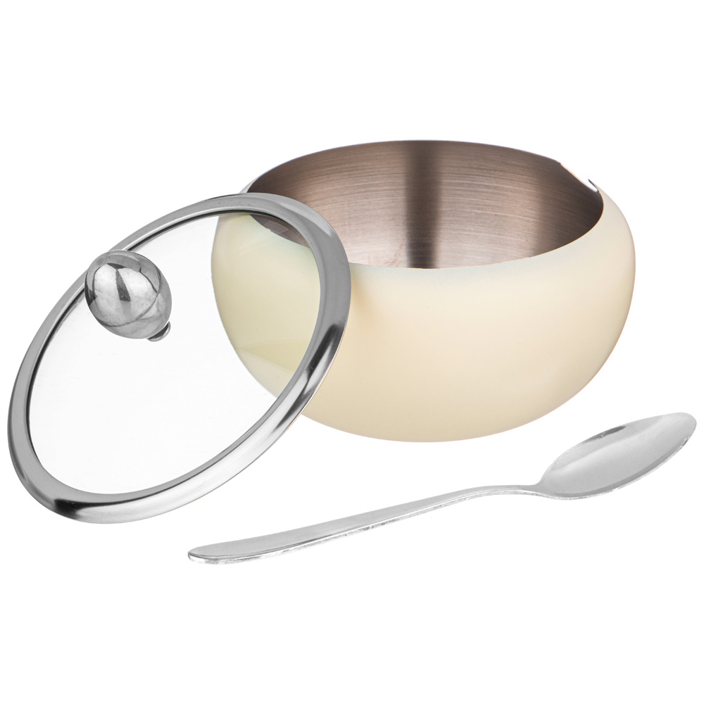 Сахарница выполнена из нержавеющей стали и имеет ложечку для насыпания, которая располагается в выемке на корпусе сахарницы.