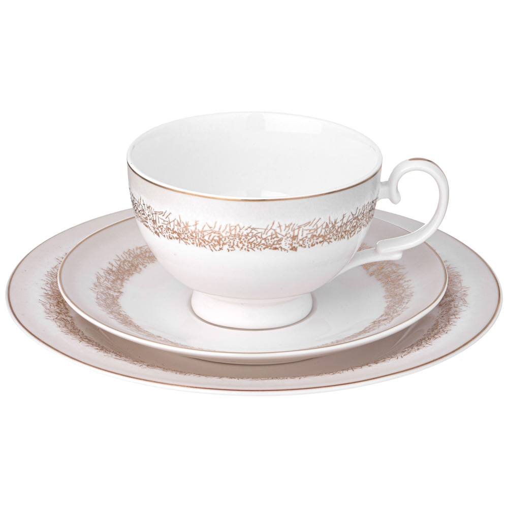 ТМ LEFARD Сервиз чайный "Золотой песок" для торжественного чаепития и семейных застолий. Изысканный фарфор Bone Pocelain с эффектом костяного фафора, тонкий и полупрозрачный, прочный и никогда не темнеет. Утонченный кружевной рельефный орнамент выглядит объемным и привлекательным благодаря различной обработке выпуклых и базовых поверхностей. Изящная золотая обводка придает блеск и торжественность. Эта посуда замечательный подарок на свадьбу, юбилей, день рождения, который наверняка пригодится каждой семье, запомнится навсегда и прослужит долгие годы. Дизайнеры торговой марки предлагают обеденный сервиз и наборы тарелок и чайных пар, чтобы сформировать полную сервировку стола предметами коллекции на 6 или 12 персон.