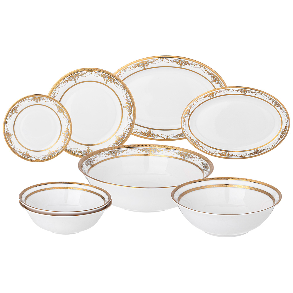 ТМ LEFARD Сервиз столовый "Дворец" для торжественных застолий и семейных обедов. Изысканный фарфор Bone Pocelain с эффектом костяного фафора, тонкий и полупрозрачный, прочный и никогда не темнеет. Классический рельефный орнамент в виде сетки выглядит объемным и привлекательным. Пересекающиеся линии уходят в бесконечность. Состояние движения подталкивает к движению вперед, наполняя энергией. Изящный золотой кант придает блеск и торжественность. Эта посуда замечательный подарок на юбилей, день рождения, новоселье, который наверняка пригодится каждой семье, запомнится навсегда и прослужит долгие годы. Дизайнеры торговой марки предлагают чайный сервиз и наборы тарелок и чайных пар, чтобы сформировать полную сервировку стола предметами коллекции на 6 или 12 персон.