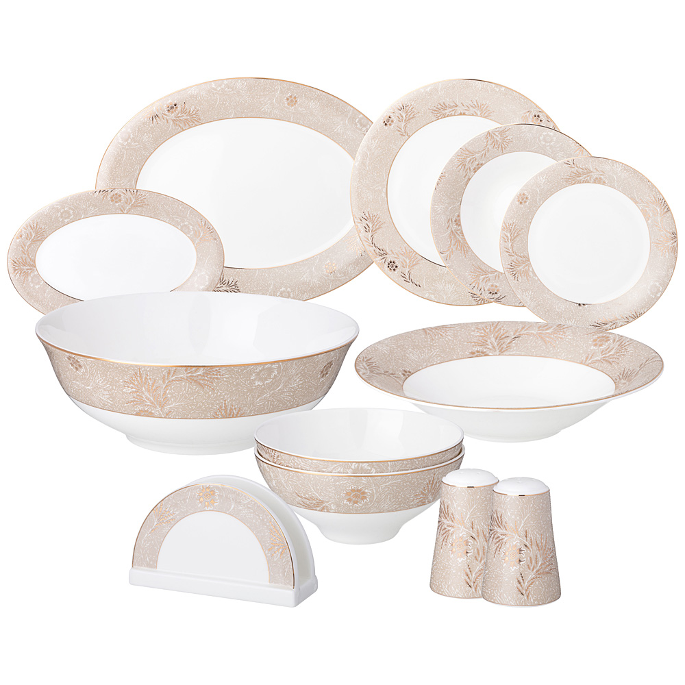 Комплектность: тарелка обеденная 27,5 см – 6 шт., тарелка закусочная 21 см – 6 шт., тарелка суповая 21,5 см – 6 шт., салатник сервировочный 23 см – 1 шт., салатник порционный 14 см – 2 шт., блюдо овальное 36*27 см – 1 шт., блюдо овальное 25,5*17 см – 1 шт., салфетница – 1 шт., набор для специй – 2 шт.
