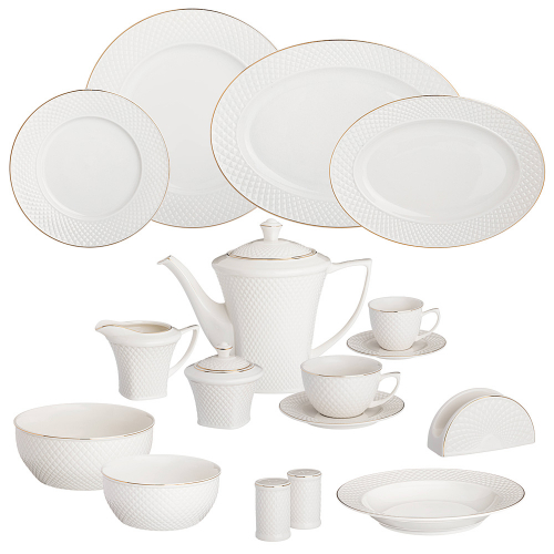 Комплектность: тарелка обеденная 25,5см - 6 шт., тарелка закусочная 20,5см - 6 шт., салатник-тарелка суповая 18см 750 мл - 6 шт., блюдо овальное 35см - 1 шт., блюдо овальное 25,5см - 1 шт, салатник 23см 1250 мл - 1 шт., салатник 15см 500 мл - 2 шт.
