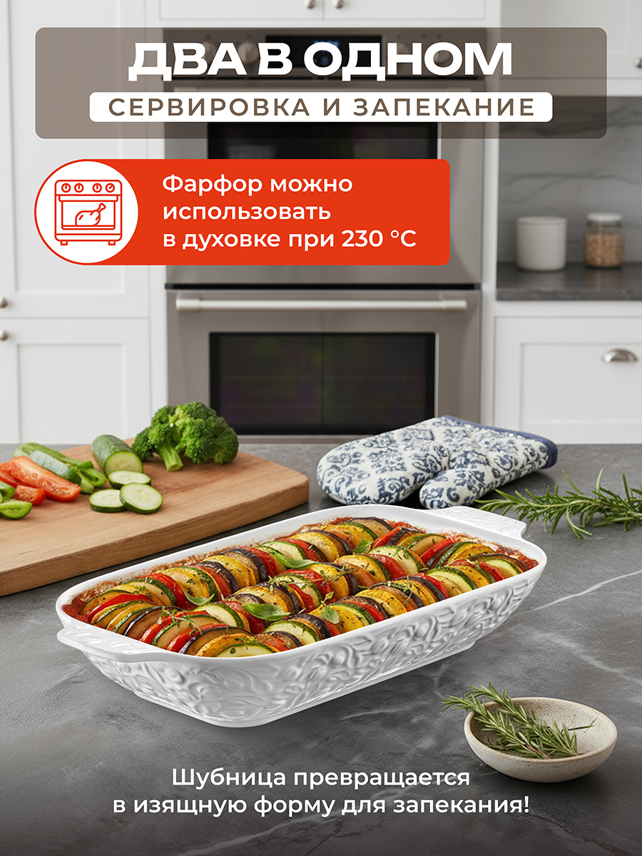 Шубница Elan Gallery из серии "Тюльпаны" – это сочетание красоты и функциональности для вашей кухни. Размер 32,5х20х5,5 см, объём 1,7 литра. Внутренний размер ёмкости 26х18,5 см. Можно использовать в роли глубокого блюда для сервировки или салатника. Прямоугольная форма с ручками выполнена из белого фарфора и украшена изящным рельефом в виде цветов. Фарфоровая ёмкость подходит для запекания мяса, овощей или рыбы в духовке. Удобна для приготовления десертов, выпечки и творожной запеканки. Благодаря красивому дизайну и удобным ручкам по бокам подойдёт для эстетичной подачи горячего блюда на стол или в роли салатницы. Можно использовать для селёдки под шубой, шашлыка, салата и разнообразных закусок. Не рекомендуется применять абразивные моющие средства. Можно использовать в посудомоечной машине, микроволновой печи и духовом шкафу при температуре до 230 градусов. Поставляется в стильной картонной коробке с логотипом бренда. Благодаря красочной коробочке не понадобится подарочная упаковка, если вы решите сделать сюрприз своим близким. Кухонный инвентарь станет полезным подарком на любой праздник и всегда пригодится в доме. В ассортименте бренда Элан Галерея можно найти красивую посуду и стильные товары для дома, которые помогут создать комфорт и уют в любом пространстве.