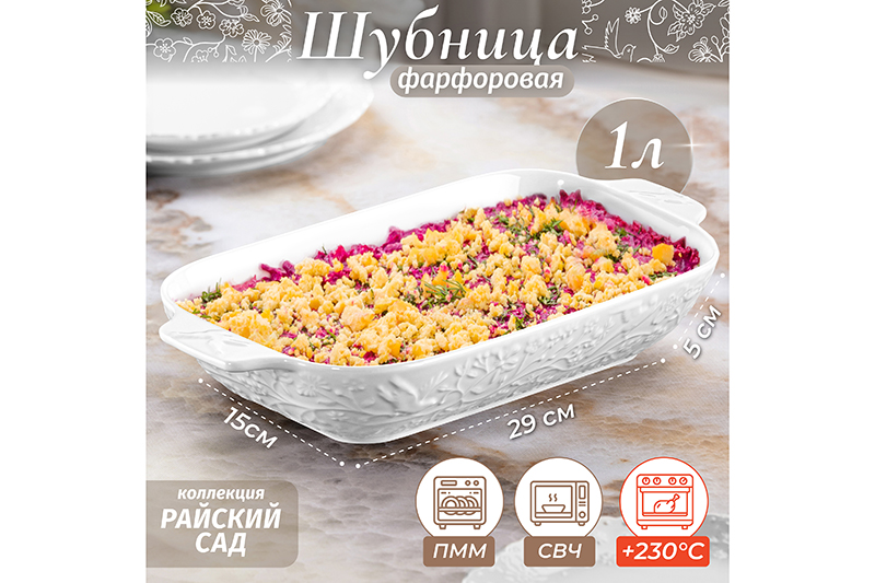 Шубница из серии «Райский сад» от Elan Gallery предназначена для эстетичной сервировки вашего стола. Размер изделия – 29х15,5х5,5 см, объём – 1 литр. Внутренний размер – 25х15 см. Выполнена из высококачественного белого фарфора. Он не впитывает цвет продуктов и легко отмывается, благодаря чему надолго сохраняет свою белизну. Поверхность изделия украшают рельефные узоры в виде лиственных веточек с аккуратными цветочными бутончиками. Вместительная ёмкость подойдёт для селёдки под шубой, холодца и плова. Предназначена как для подачи, так и для запекания ваших любимых блюд в духовке. Глубокое блюдо позволит вам эстетично преподнести угощения из рыбы и мяса. Порадуйте себя большой порцией шашлыка или лапши, разложите суши и роллы, бутерброды и фруктовую нарезку. Выложите нарезанные яйца, сыр и другие закуски, чтобы за большим столом каждому досталось любимое угощения. Заполните большую ёмкость разнообразной выпечкой и сладостями: вафлями, мармеладом, пряниками, шоколадом и печеньем, – дополните семейное чаепитие. Создайте композицию из конфет, ягод, кексов и сухофруктов, чтобы удивить гостей своей кулинарной фантазией! Не рекомендуется применять абразивные моющие средства. Подходит для использования в посудомоечной машине, микроволновой печи и духовом шкафу при температуре до 230 градусов. Поставляется в дизайнерской картонной коробке – благодаря ей вам не потребуется дополнительная подарочная упаковка. Фарфоровая сервировочная посуда будет оригинальным подарком для хозяйки, ценящей не только практичность, но и привлекательность. Серия «Райский сад» от бренда Элан Галерея станет украшением любого кухонного инвентаря и позволит собрать красивый сервиз в едином стиле! /