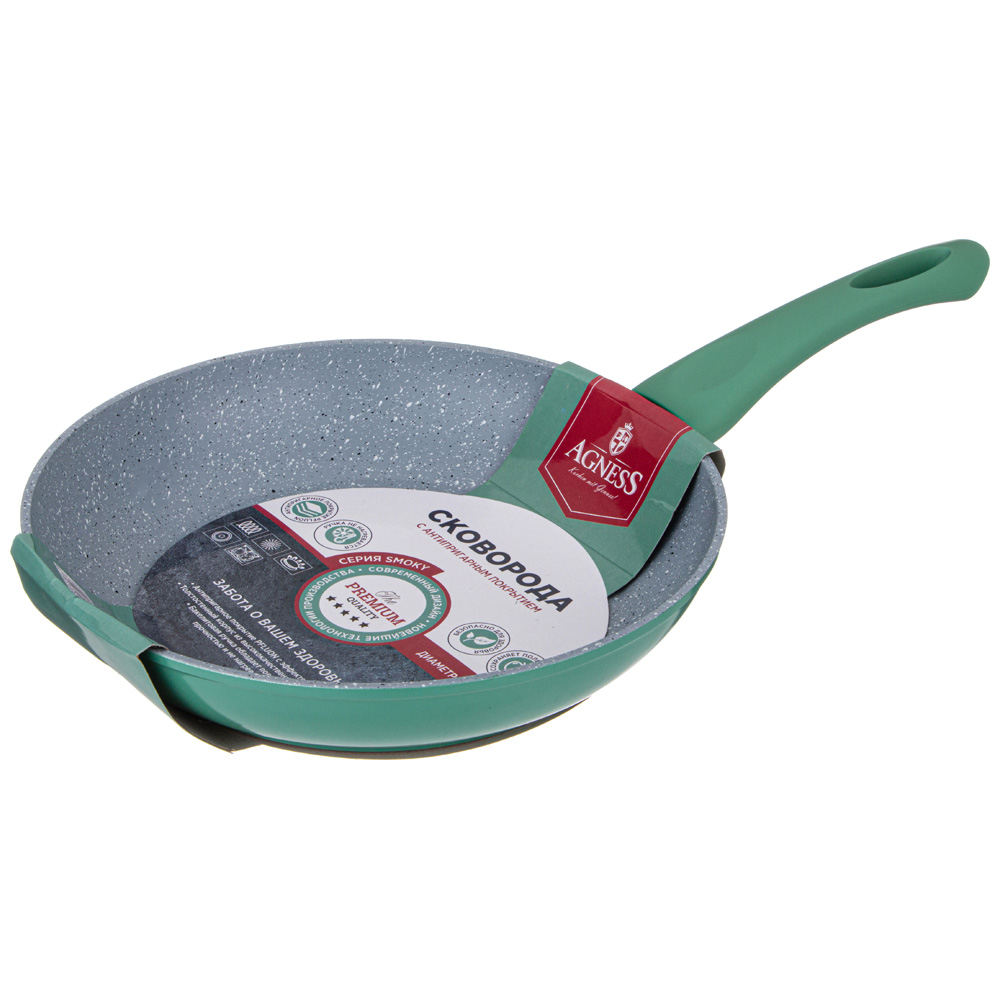 СКОВОРОДА AGNESS С АНТИПРИГАРНЫМ ПОКРЫТИЕМ "SMOKY"- это идеальный выбор для тех, кто ценит удобство и функциональность в посуде. Одним из главных достоинств этой сковороды является ее антипригарное покрытие, которое позволяет готовить без использования большого количества масла, а также обеспечивает равномерное распределение тепла. Благодаря этому, продукты готовятся быстрее и сохраняют свои полезные свойства.Быстрое нагревание сокращает время приготовления и сохраняет вкус и аромат продуктов. Многослойная структура покрытия обеспечивает превосходные эксплуатационные качества и увеличивает срок службы, не содержит PFOA.Эргономичная ручка из бакелита с мягким покрытием SOFT TOUCH не нагревается и не плавится, обеспечивает безопасное использование сковородки в процессе приготовления пищи. Посуда AGNESS - это современный дизайн и новейшие технологии производства.